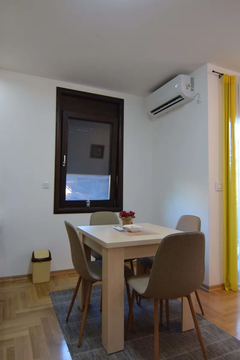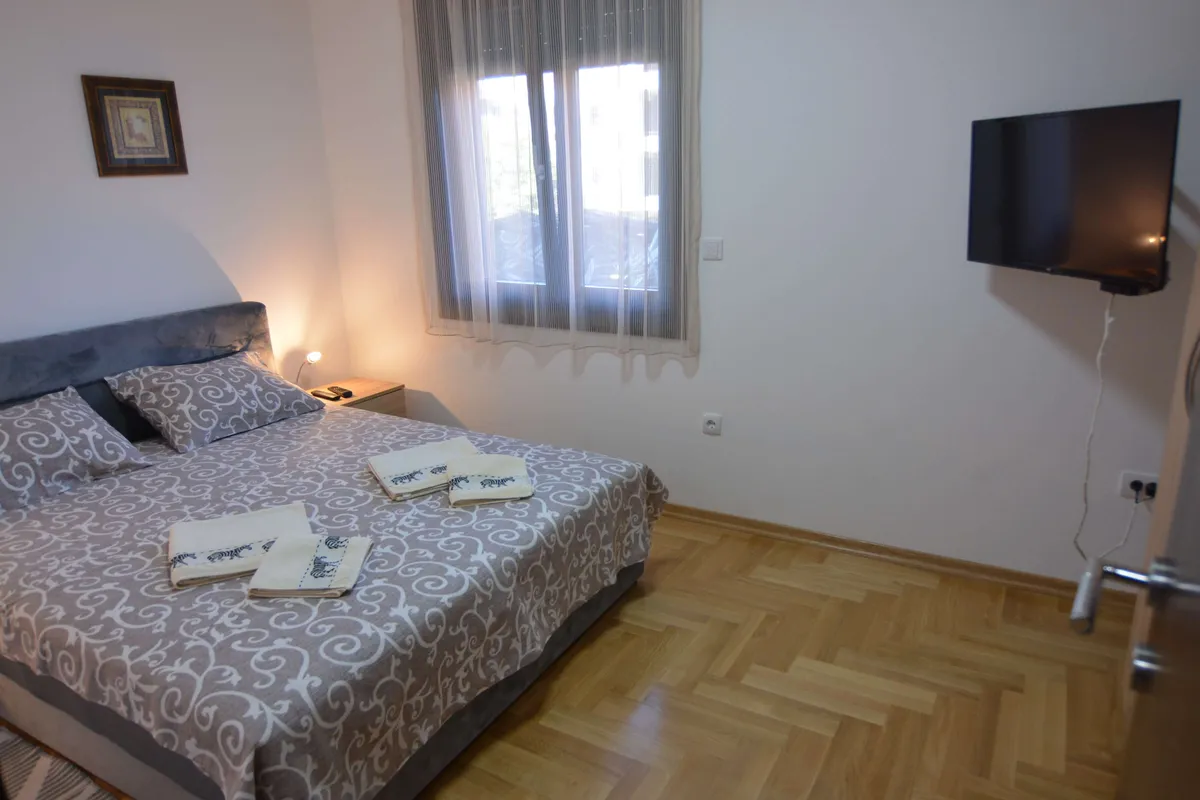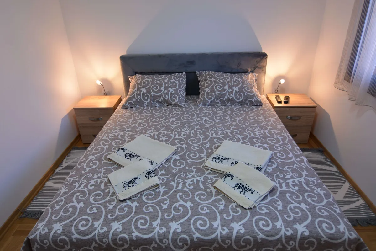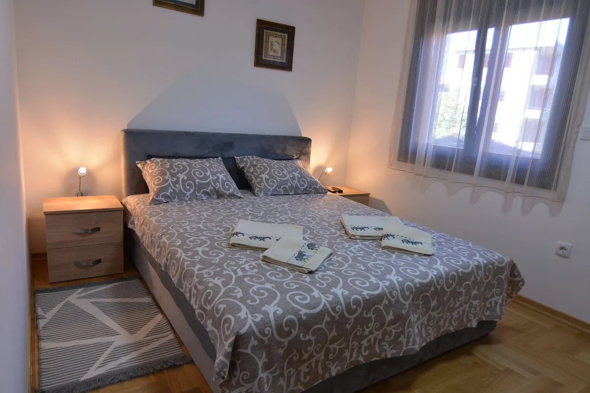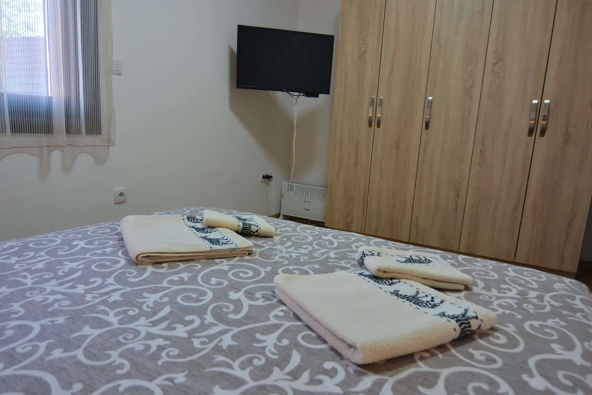 Poseduje dnevni boravak sa kuhinjom, odvojenu spavaću sobu (francuski ležaj), kupatilo, terasu i hodnik. Namenjen je za boravak 2 odrasle osobe i jednog deteta. Gostima je na raspolaganju WiFi, klima, kablovska.