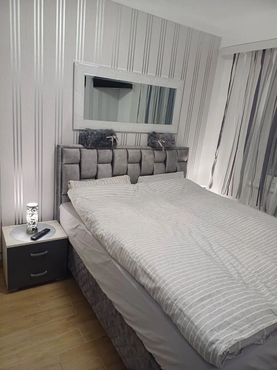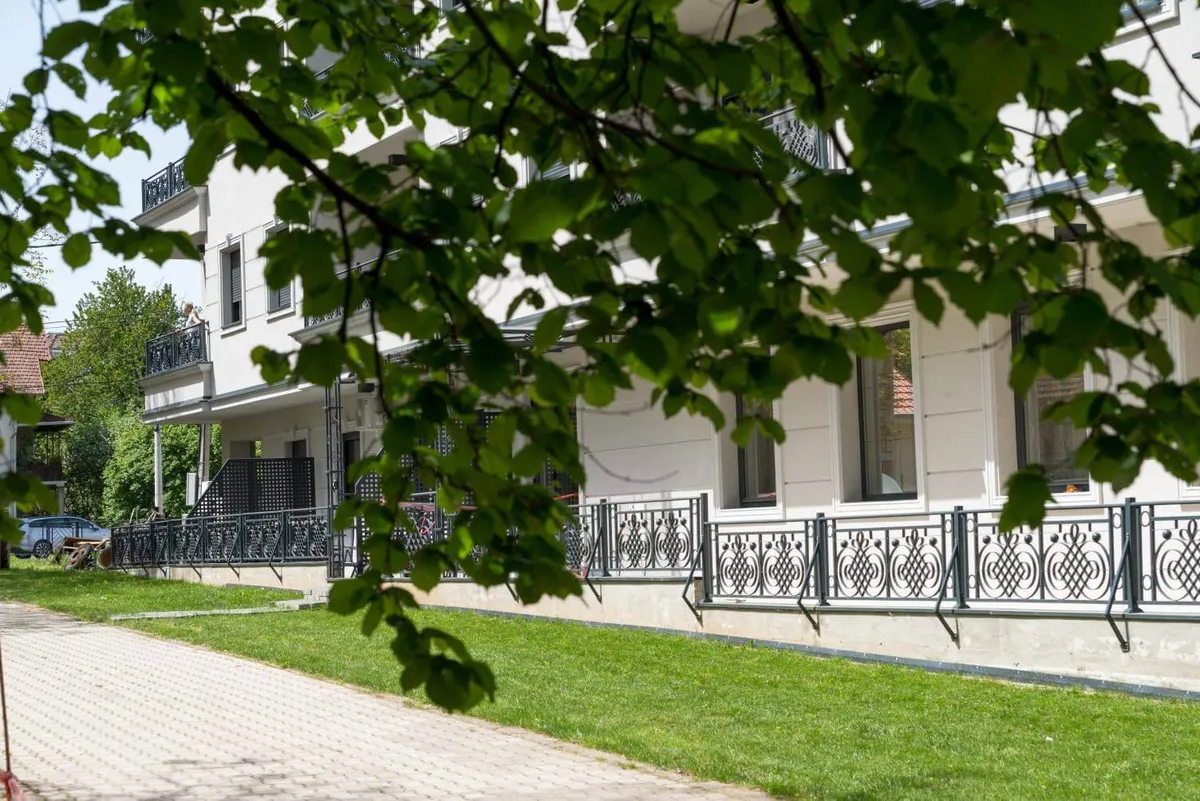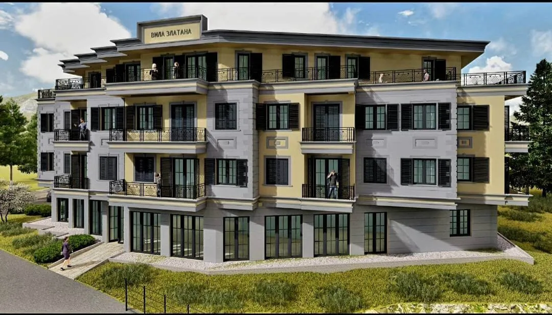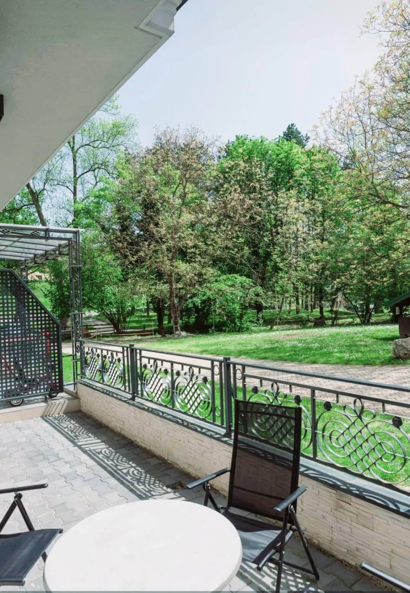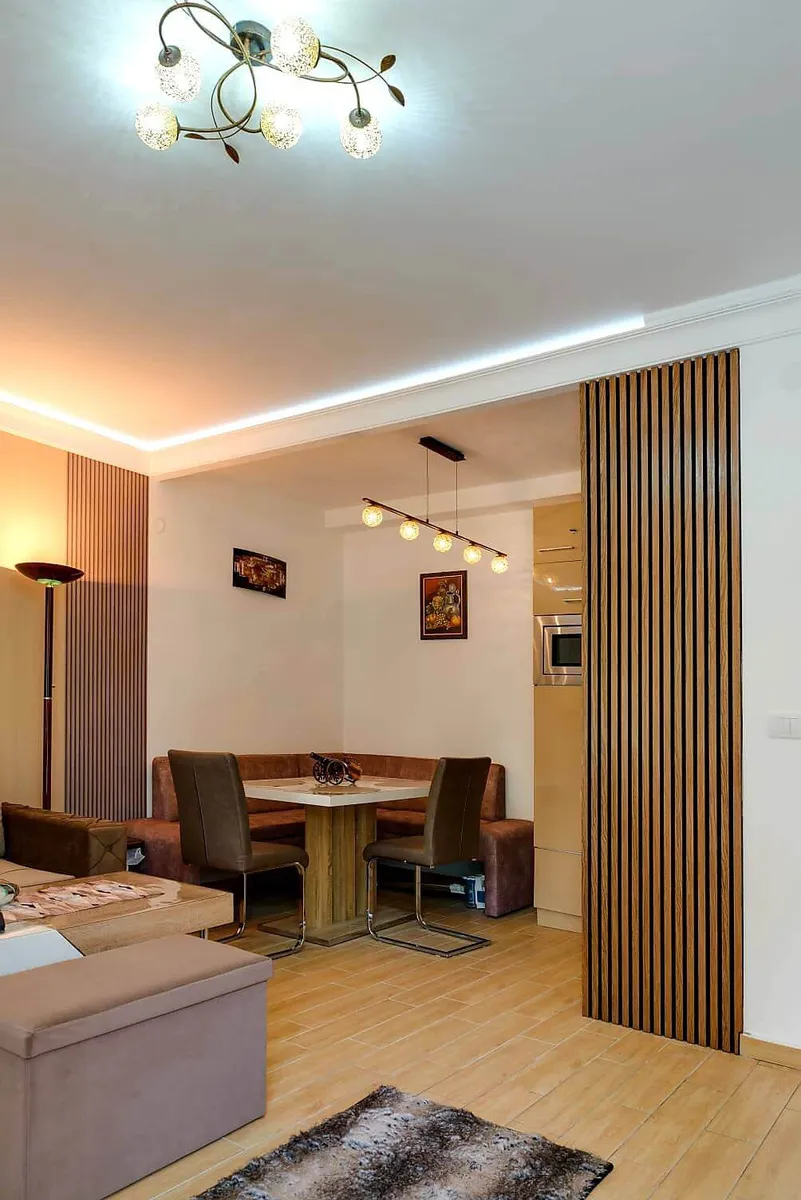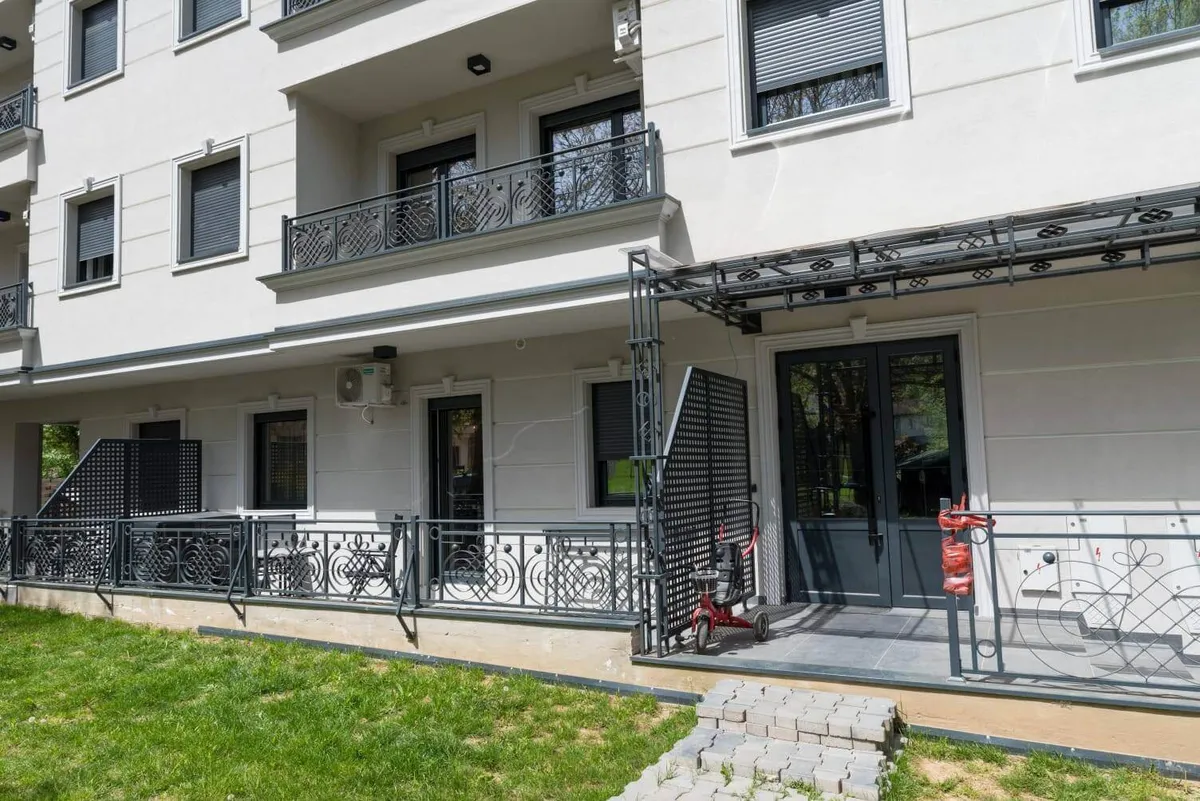 Površina apartmana je 38 m2 + 15 m2 terasa sa pogledom na park. Nalazi se u prizemlju zgrade. Poseduje odvojenu spavaću sobu (francuski ležaj), dnevni boravak (garnitura na razvlačenje) sa kompletno opremljenom kuhinjom, kupatilo i terasu.