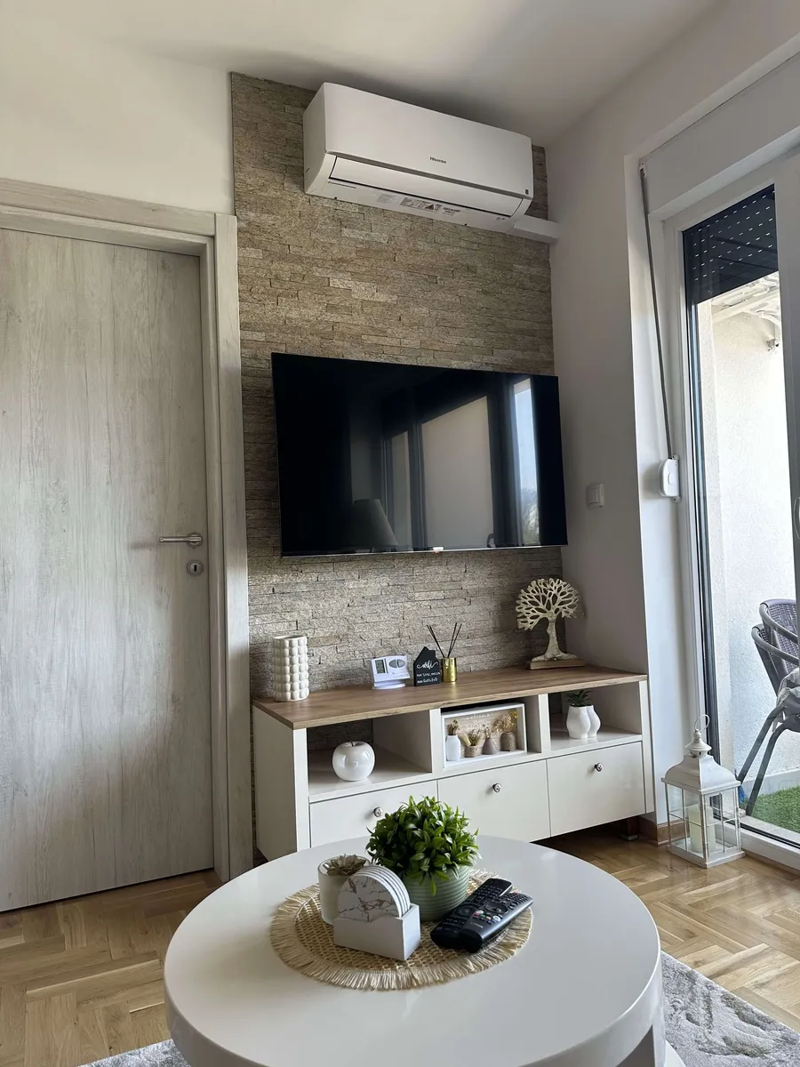 Površine 40 m2, poseduje odvojenu spavaću sobu, kupatilo, terasu sa garniturom za sedenje, kuhinju, dnevni boravak. Gostima apartmana je na raspolaganju wi fi net, kablovska tv, klima, peširi, posteljina, pegla za veš, fen.