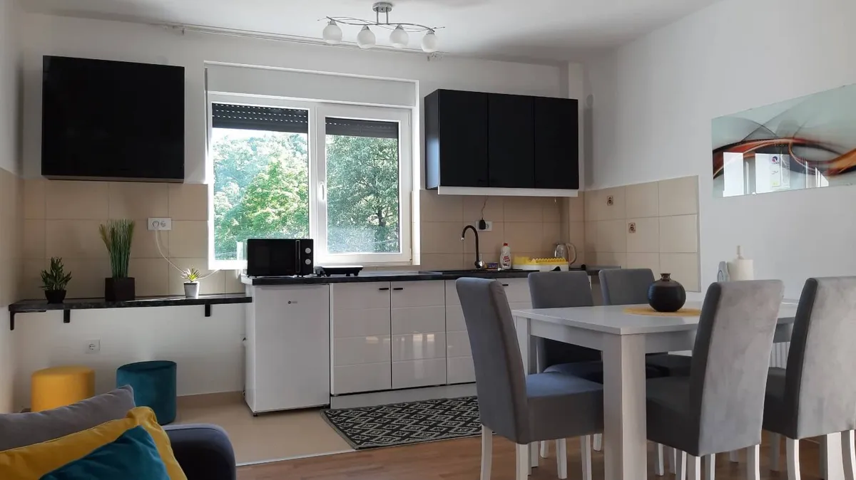 Na samo 10 km je ski staza na prelepoj planini Goč. Poseduje dnevni boravak sa kompletno opremljenom kuhinjom, odvojenu spavaću sobu, kupatilo, ostavu i veliku terasu sa predivnim pogledom ka šetalištu . Opremljen je LCD i smart televizorima, klimom, centralnim i podnim grejanjem, direktnom Internet konekcijom i WiFI, kablovskom televizijom, te mnogobrojnim kućanskim aparatima( frižider,mikrotalasna, indukciona grejna ploča, toster, kokičar, mikser, pegla, daska za peglanje, usisivač, fen i ostalo). U večernjim satima s terase čujan je žubor potoka koji stvara opuštajuću atrmosferu i čini Vaš odmor posebnim.