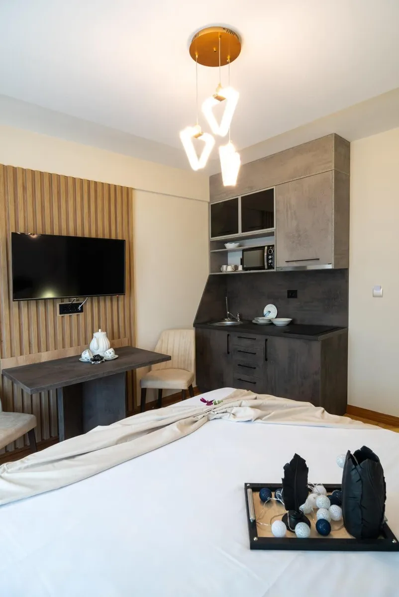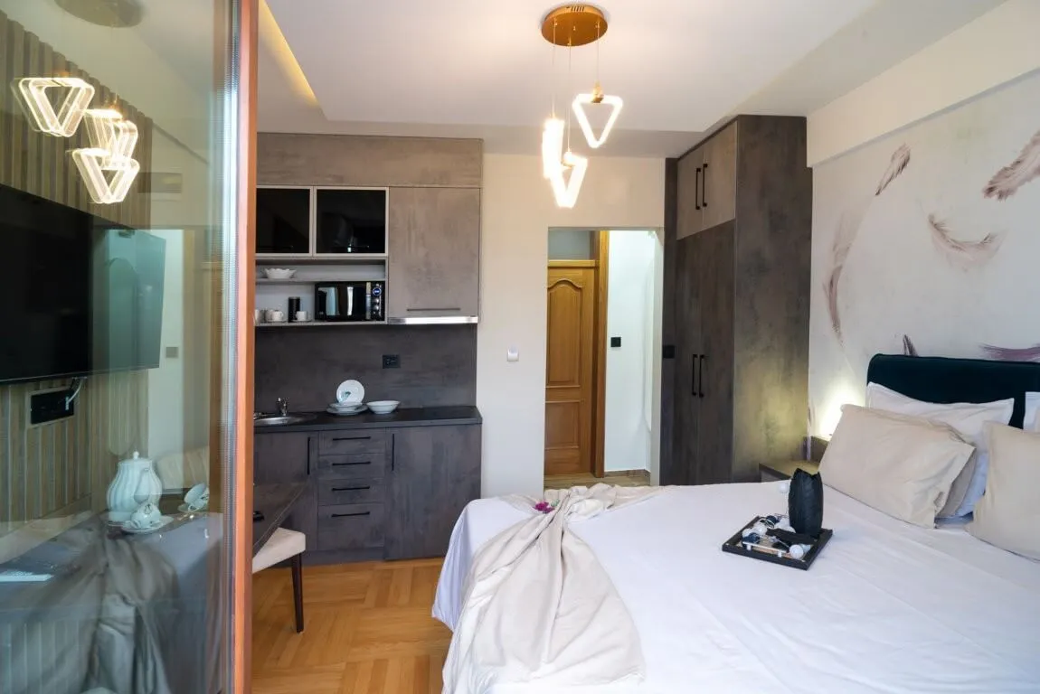 Ekskluzivno! Luksuzan, nov, moderno opremljen studio na samom šetalištu Vrnjačke promenade, smešten na drugom spratu kvalitetne zgrade sa liftom. Moderno opremljen studio veličine 25 m2 sa prelepom velikom terasom namenjen za smeštaj 2 osobe. Studio od sadržaja ima klima uređaj, spring bed ležaj, komplet moderno opremljenu kuhinju sa miktotalasnom pećnicom, smart tv, kablovska, luksuzno opremljeno kupatilo sa fenom za kosu, senzorsku bateriju za lavabo, wi-fi internet. Za goste koji borave duže od pet dana obezbeđen je besplatan parking prostor. Ovaj luksuzni studio je savršen za goste koji preferiraju smeštaj visoke klase. Dobro došli "Apartmani Grujić-Promenada"