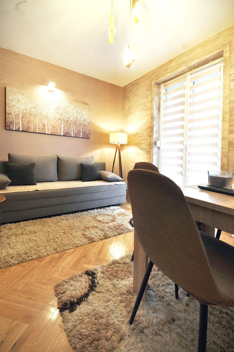 Kompletno opremljen apartman poseduje spavacu sobu-francuski lezaj, prostran dnevni boravak-garnitura na razvlacenje, kompletno opremljenu kuhinju, kupatilo sa toaletnim priborom i peskirima i terasu. Wifi, besplatan parking u sklopu objekta, fen, pegla i daska za peglanje, strujni kotao, klima. Smestaj je za 4 osobe.