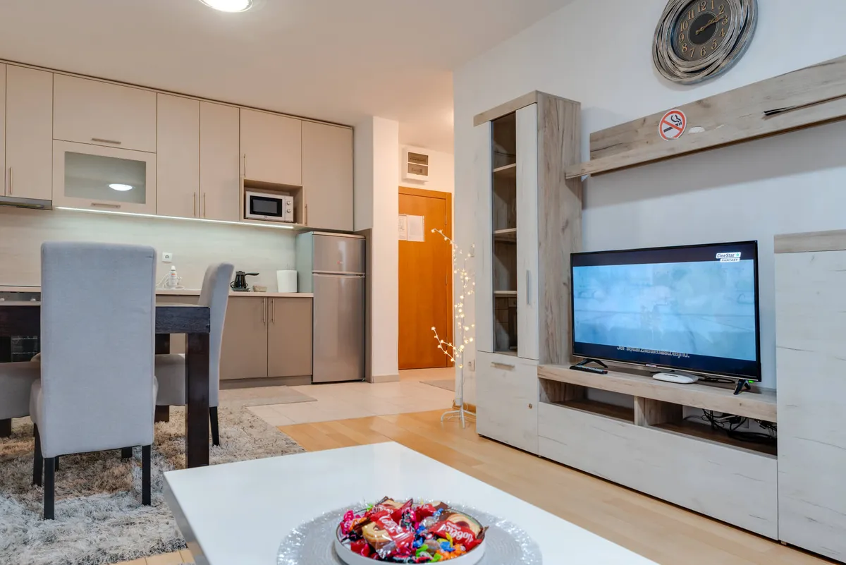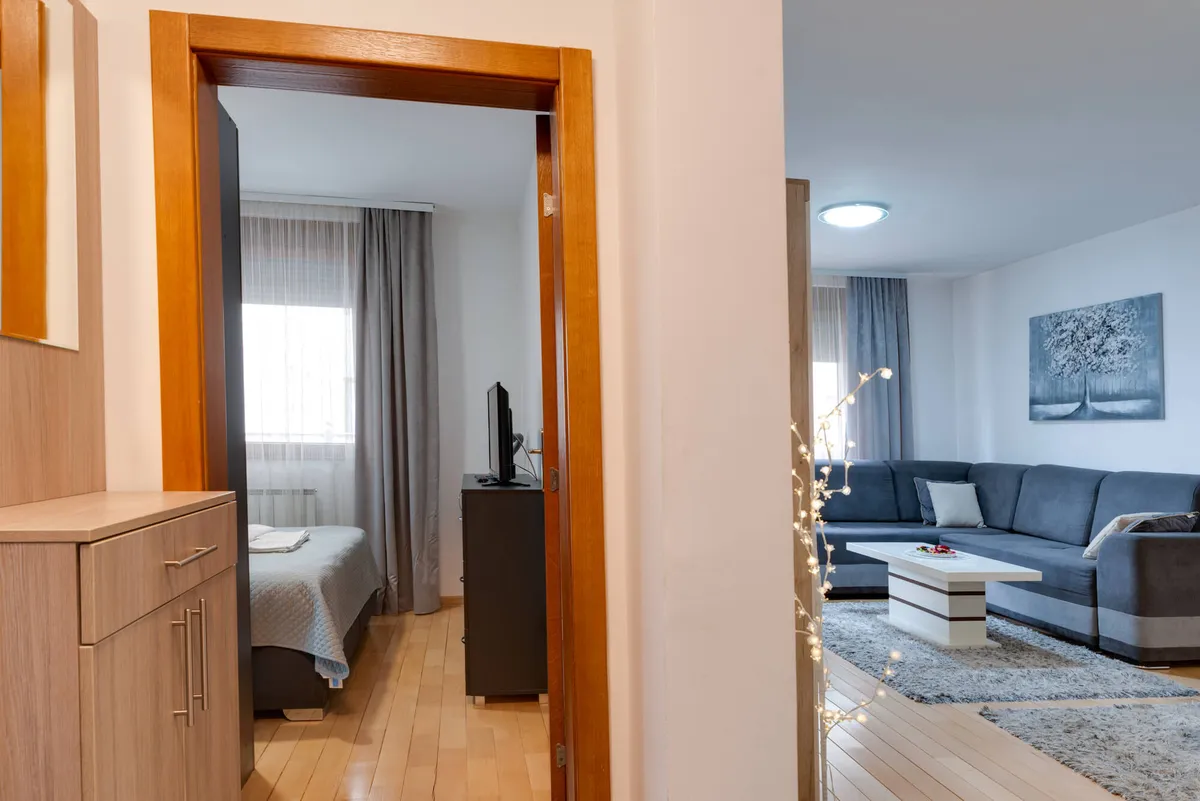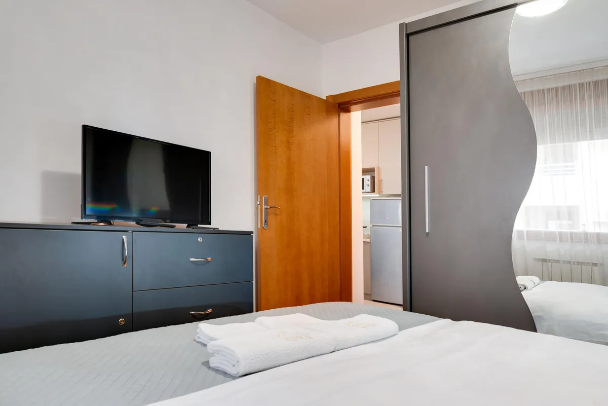 Apartman je idealan za boravak do četiri odrasle osobe. Sastoji se od odvojene spavaće sobe, prostranog dnevnog boravka sa kuhinjom, kupatila i terase. Gostima su obezbeđeni besplatan Wi-Fi, kablovska televizija, klima uređaj i parking prostor.