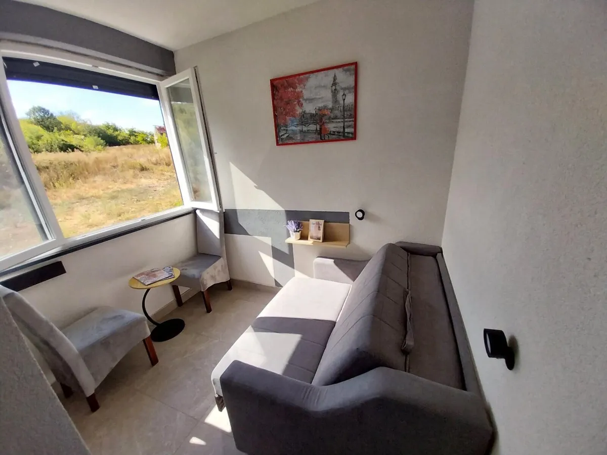 Poluzatvorena terasa koja po potrebi služi kao prijatan kutak za odmor, ili kao dodatna soba sa rasklopivim kaučem.
