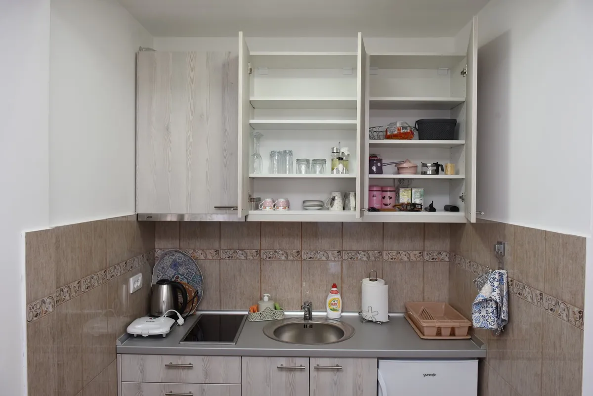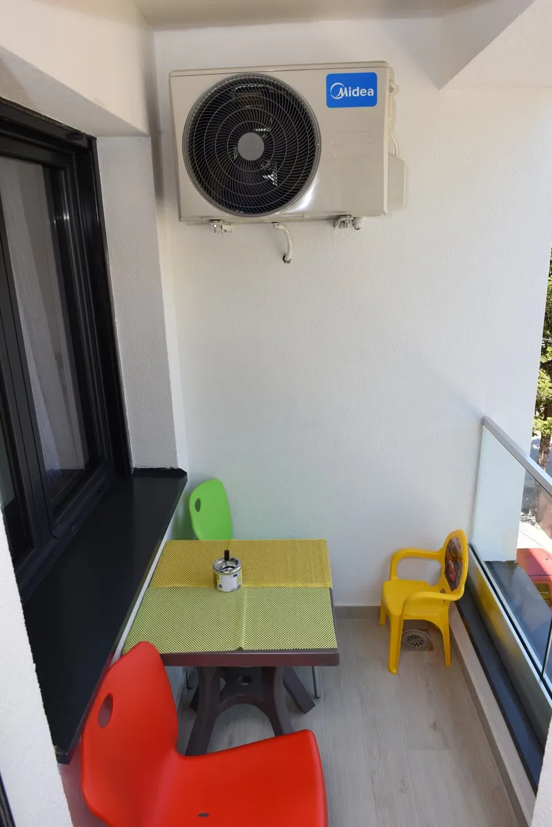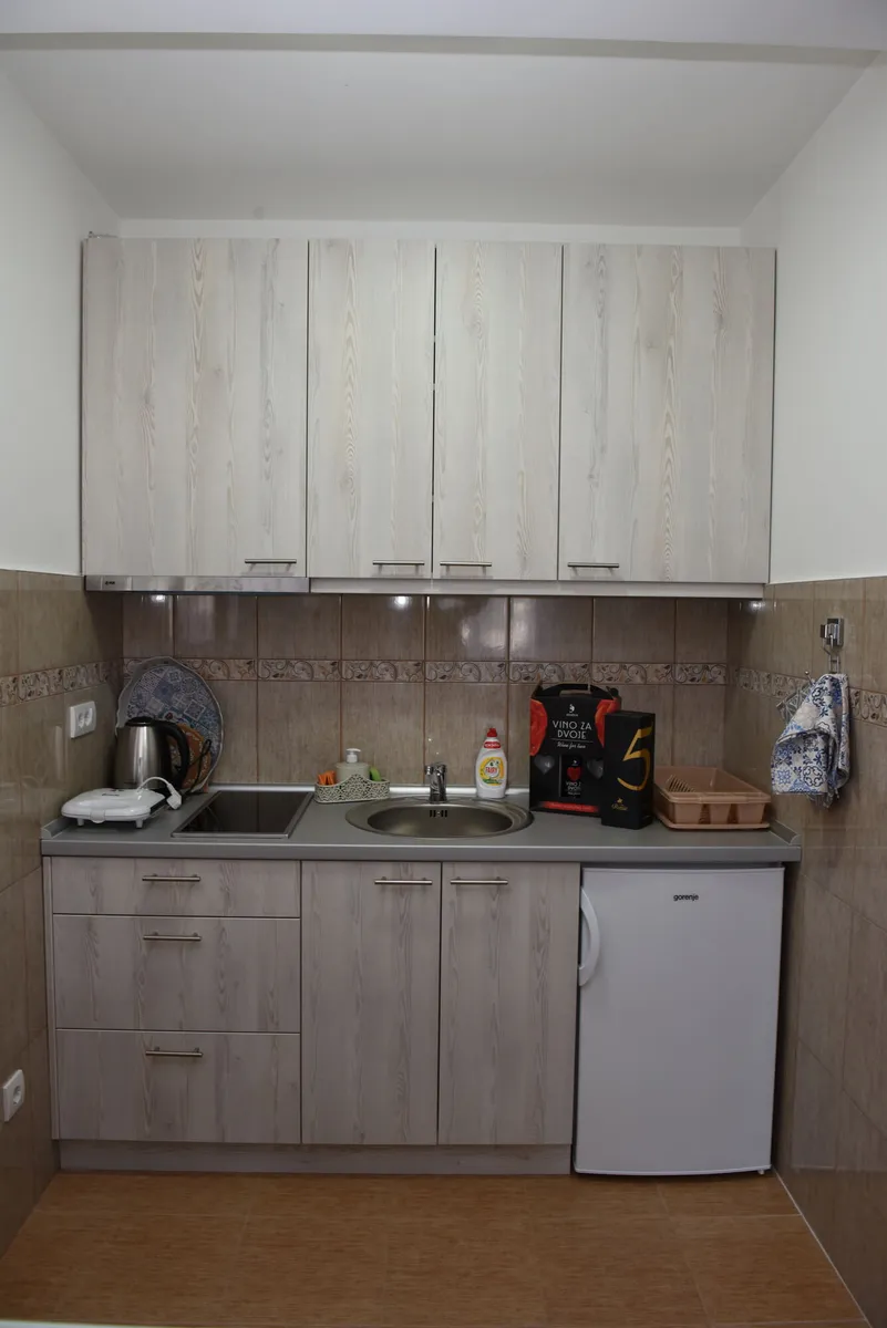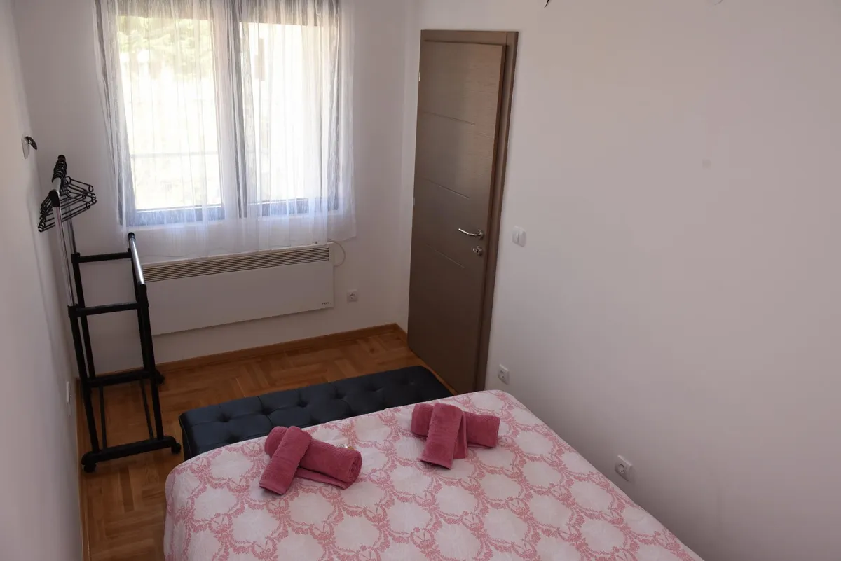 Poseduje ugaonu garnituru na rasklapanje za 3 osobe plus spavaću sobu sa francuskim ležajem, terasu i kupatilo.