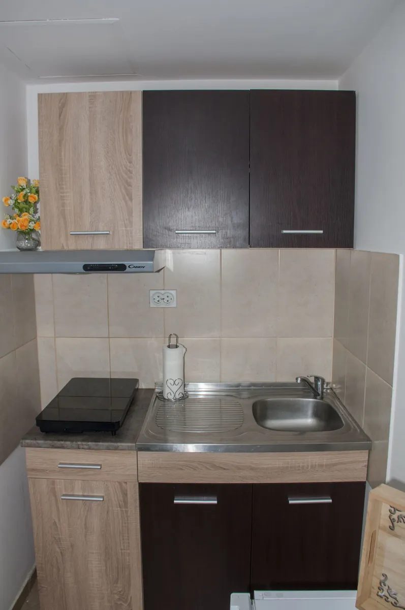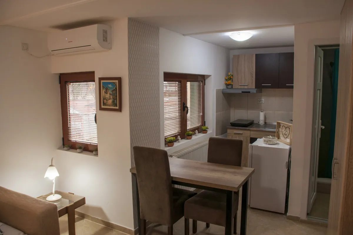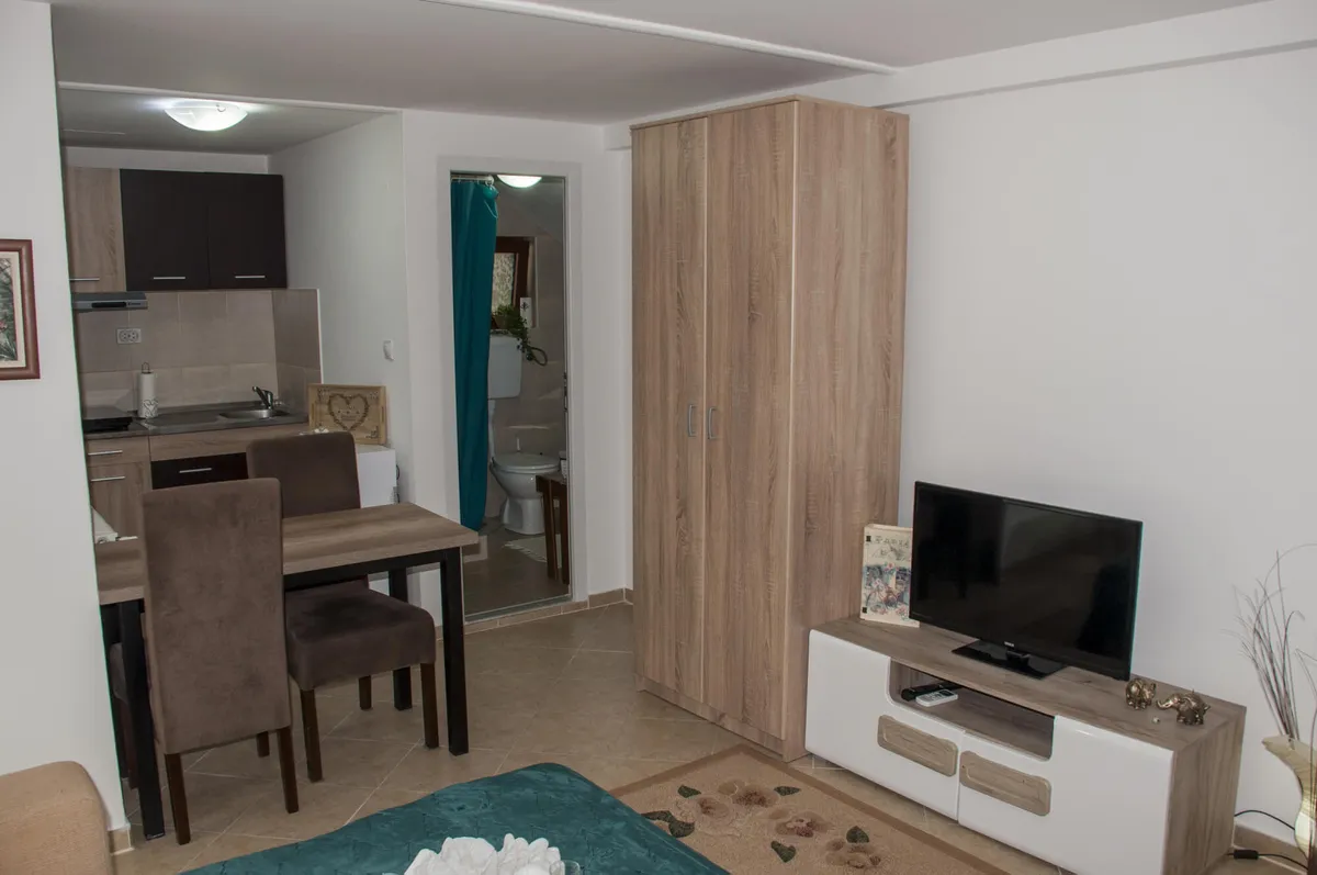 Tipa je studio i ima kuhinju, kupatilo, WiFi i kablivsku televiziju. Namenjen je za boravak 2 odrasle osobe.