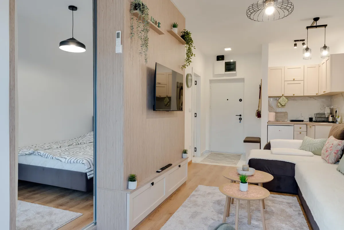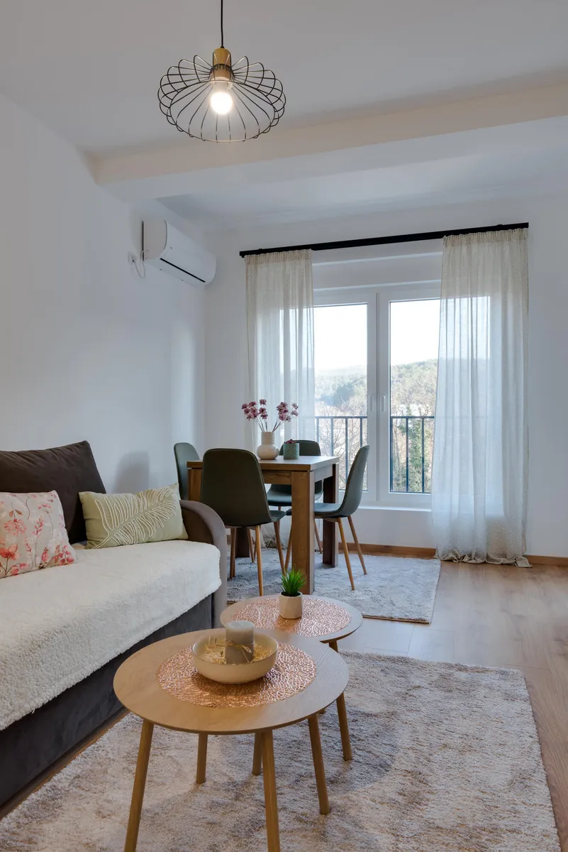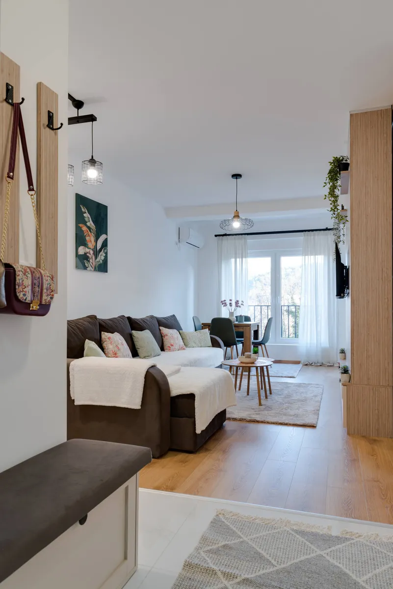 Osim spavace sobe sa francuskim lezajem, u ponudi je i prostrana ugaona garnitura na razvlacenje.