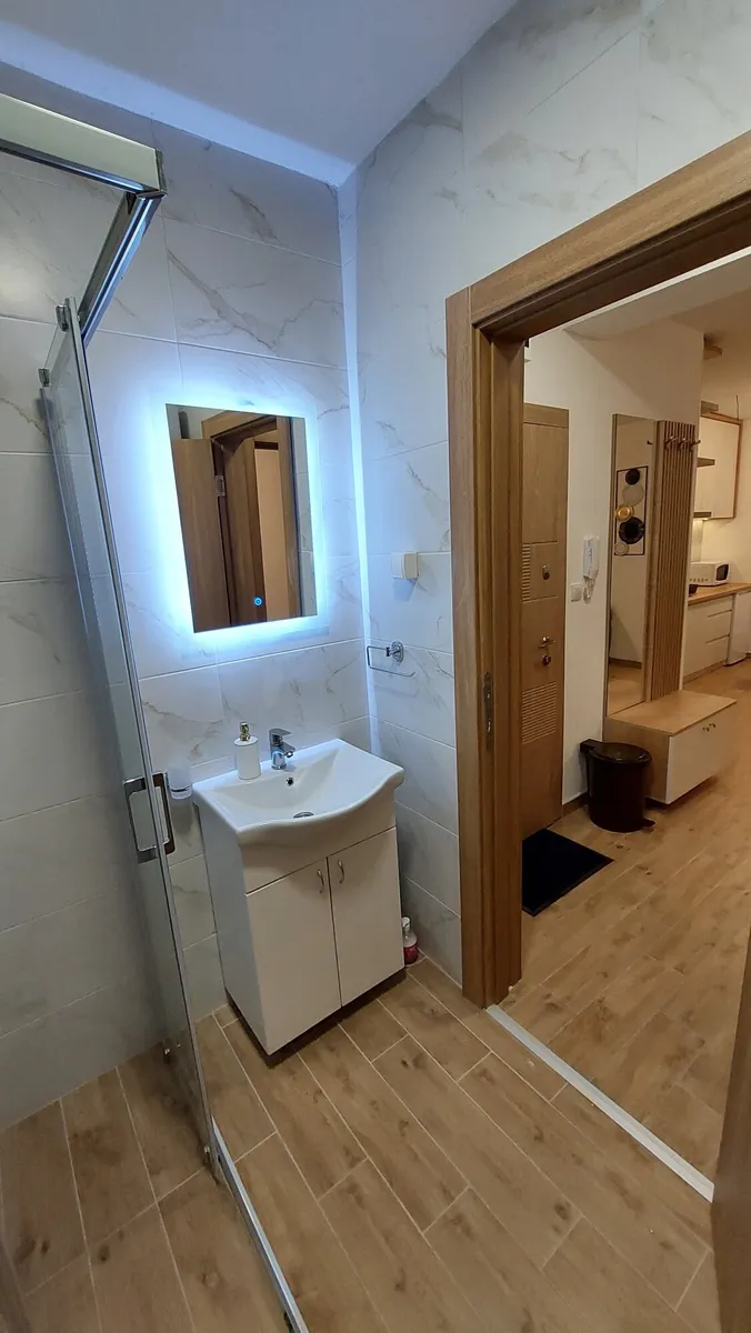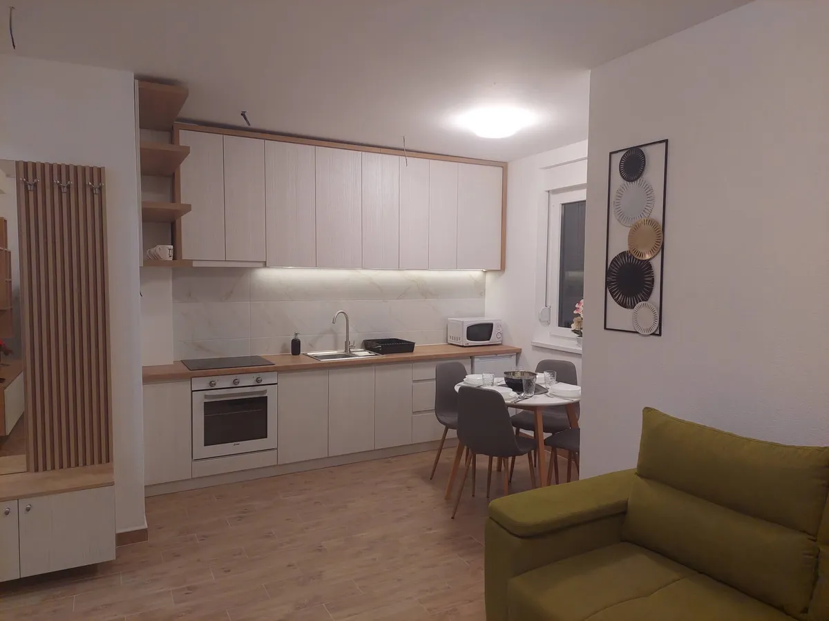 Poseduje odvojenu spavaću sobu, dnevni boravak sa trpezarijom i kuhinjom, kupatilo i terasu.