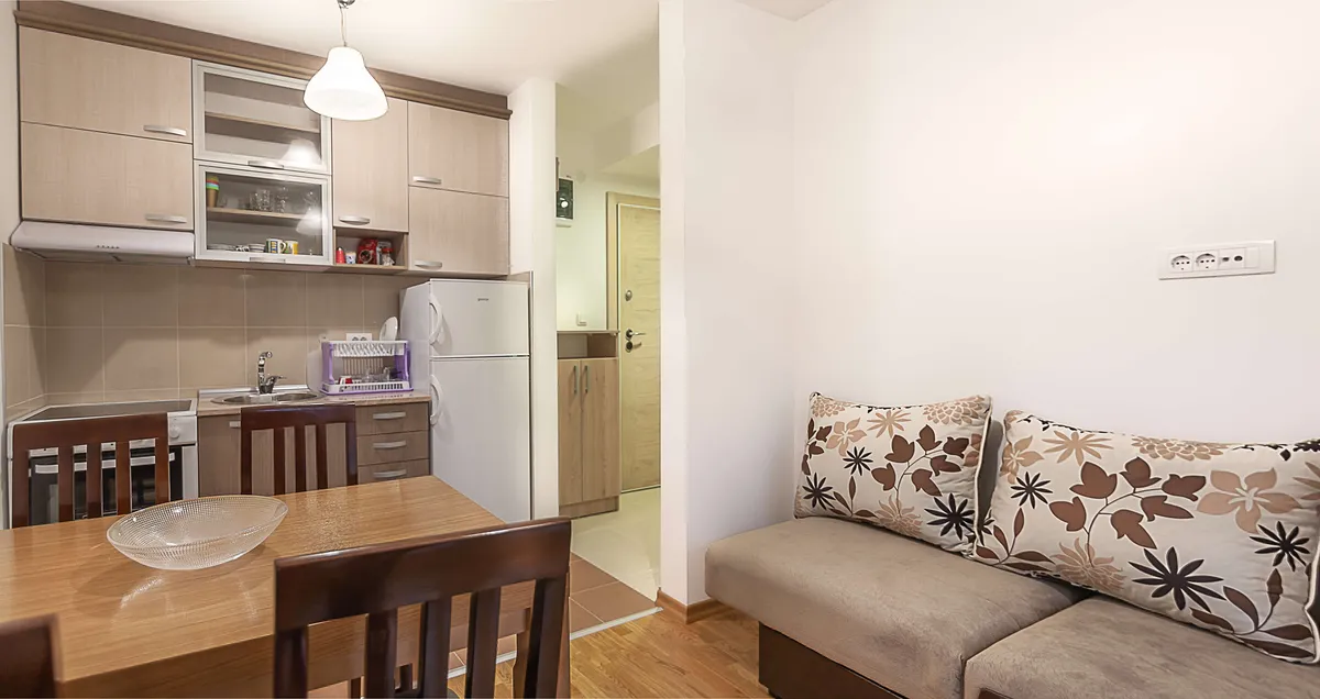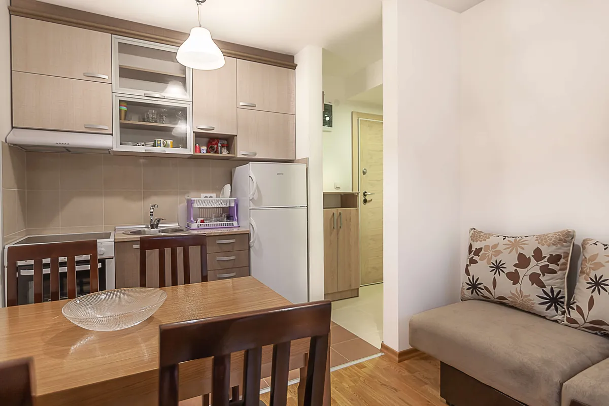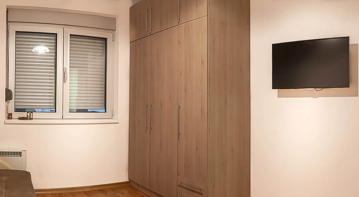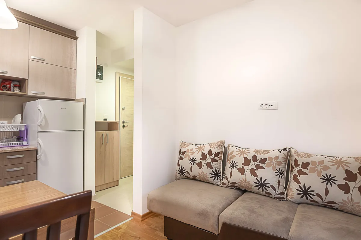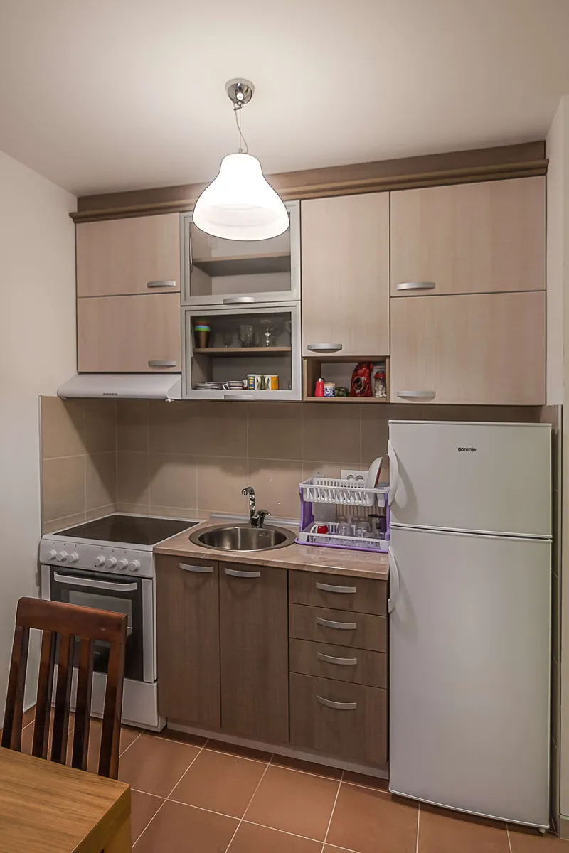Nov je, nalazi se u visokom prizemlju, opremljen novim aparatima za domaćinstvo (takođe i veš mašinom). Namenjen je za boravak do 3 osobe. Ima parking mesto, interfon, terasu, kablovsku tv, Internet, fen itd.