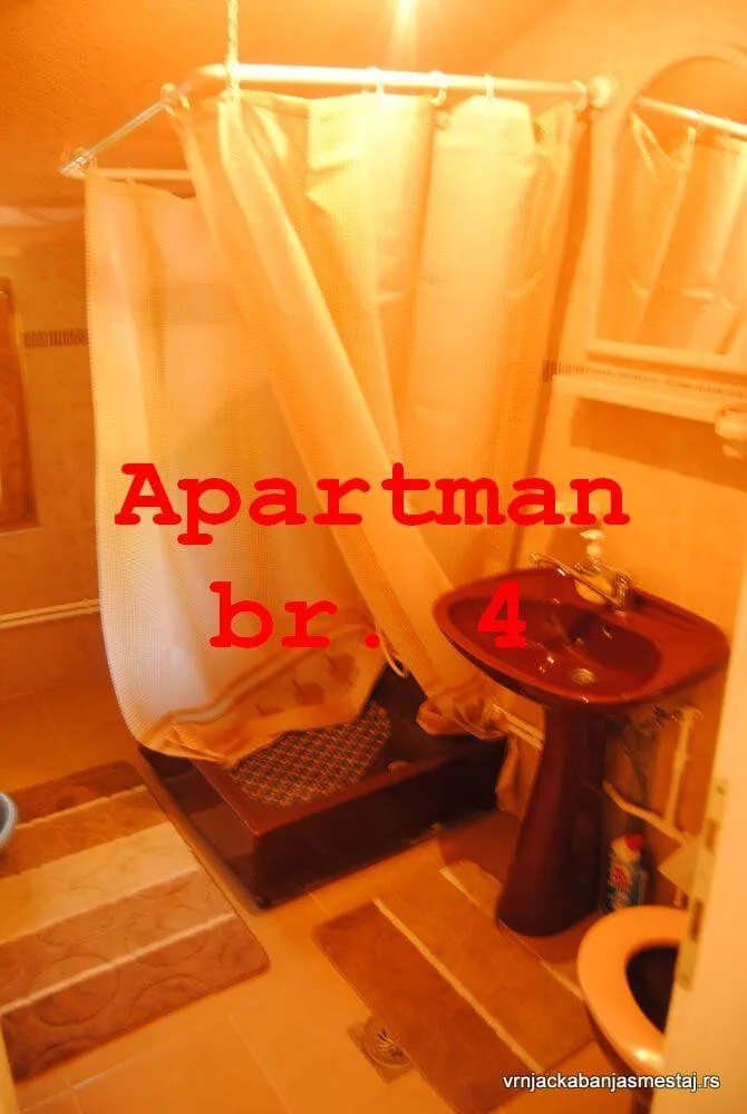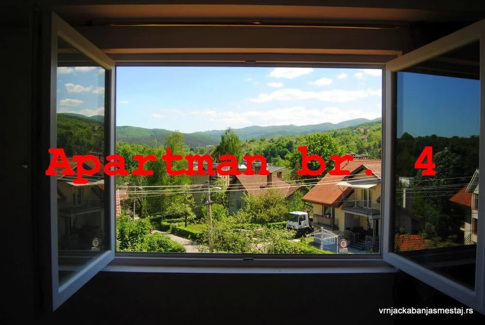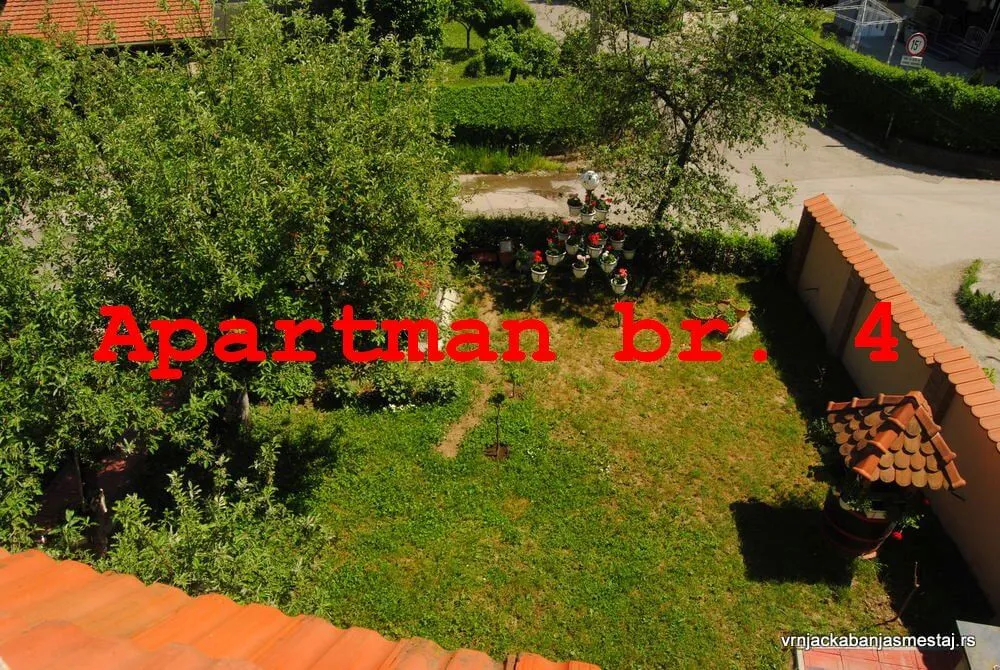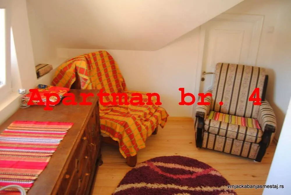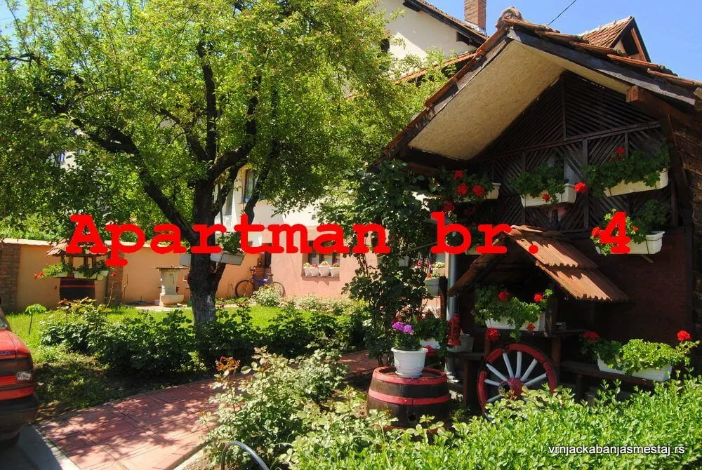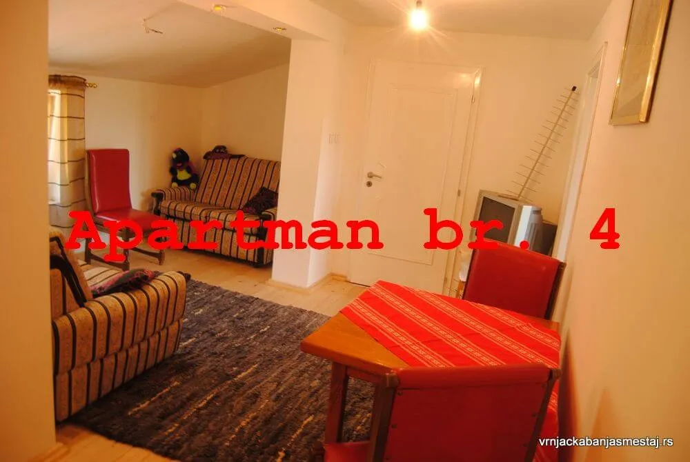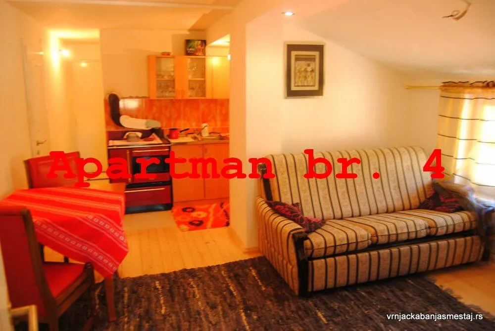 Apartman br. 4 se nalazi na 500 m od centar Vrnjačke Banje. Ima odvojenu spavaću sobu (francuski ležaj), dnevni boravak (trosed i dvosed) sa kuhinjom, hodnik, terasu i trem. Opremljen je Internetom, TV-om i klimom.