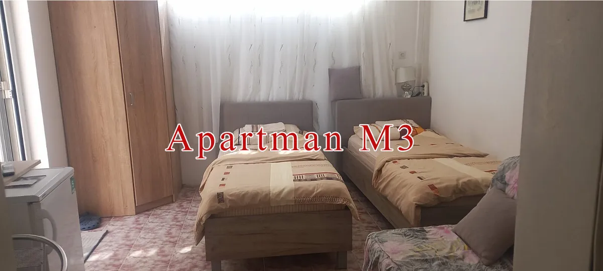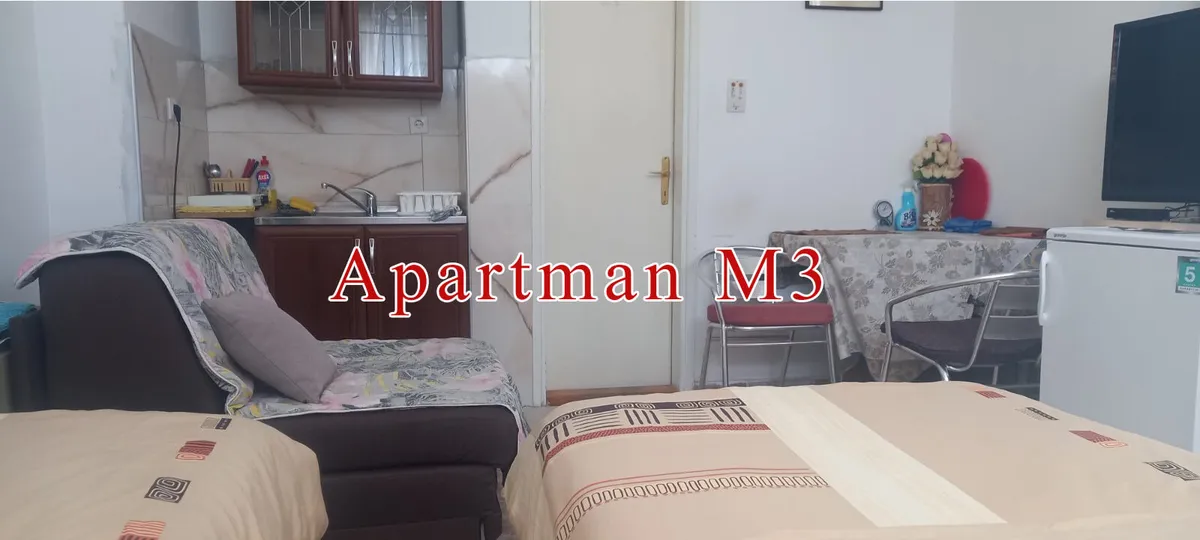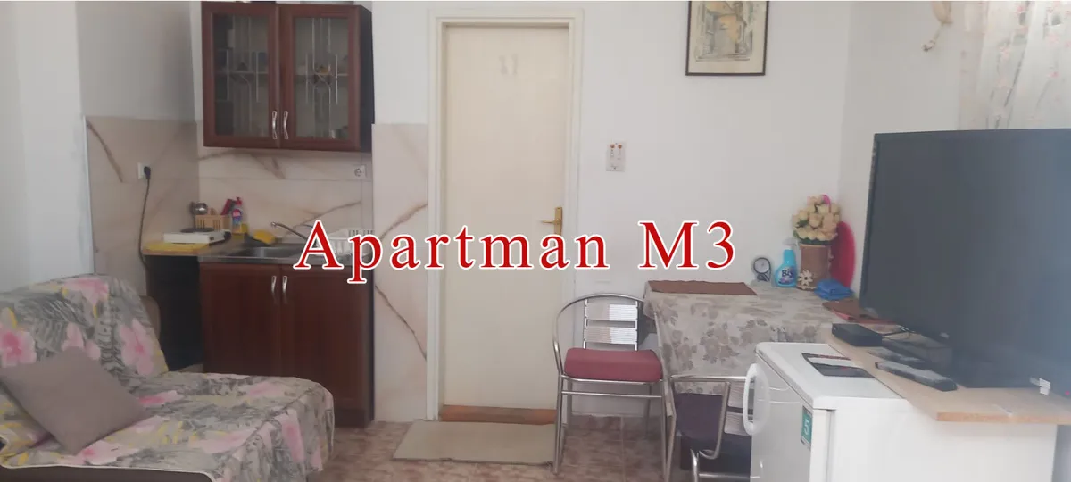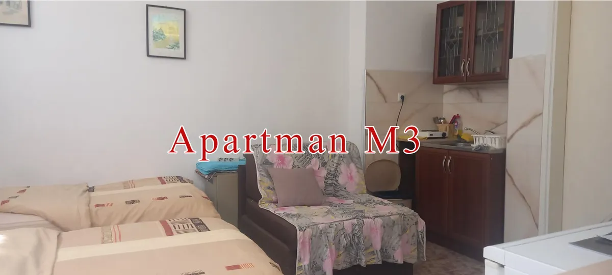 Apartman M3 je tipa studio površine 22 m2. Poseduje čajnu kuhinju, TV i klimu. Namenjen je za boravak 2 + 1 osbe (francuski ležaj + fotelja na razvlačenje).