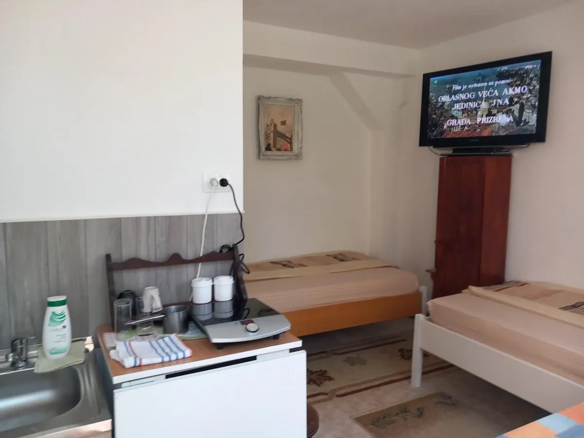 Apartman V1 se nalazi strogom centru Vrnjačke Banje. Površina apartmana je 22 m2. Tipa je studio i namenjen je za boravak do 2 + 1 osobe, ima kuhinju, wc i kupatilo. Gosti mogu koristiti terasu. Apartman ima TV i klimu.