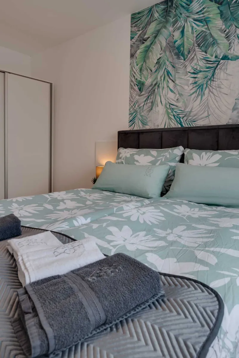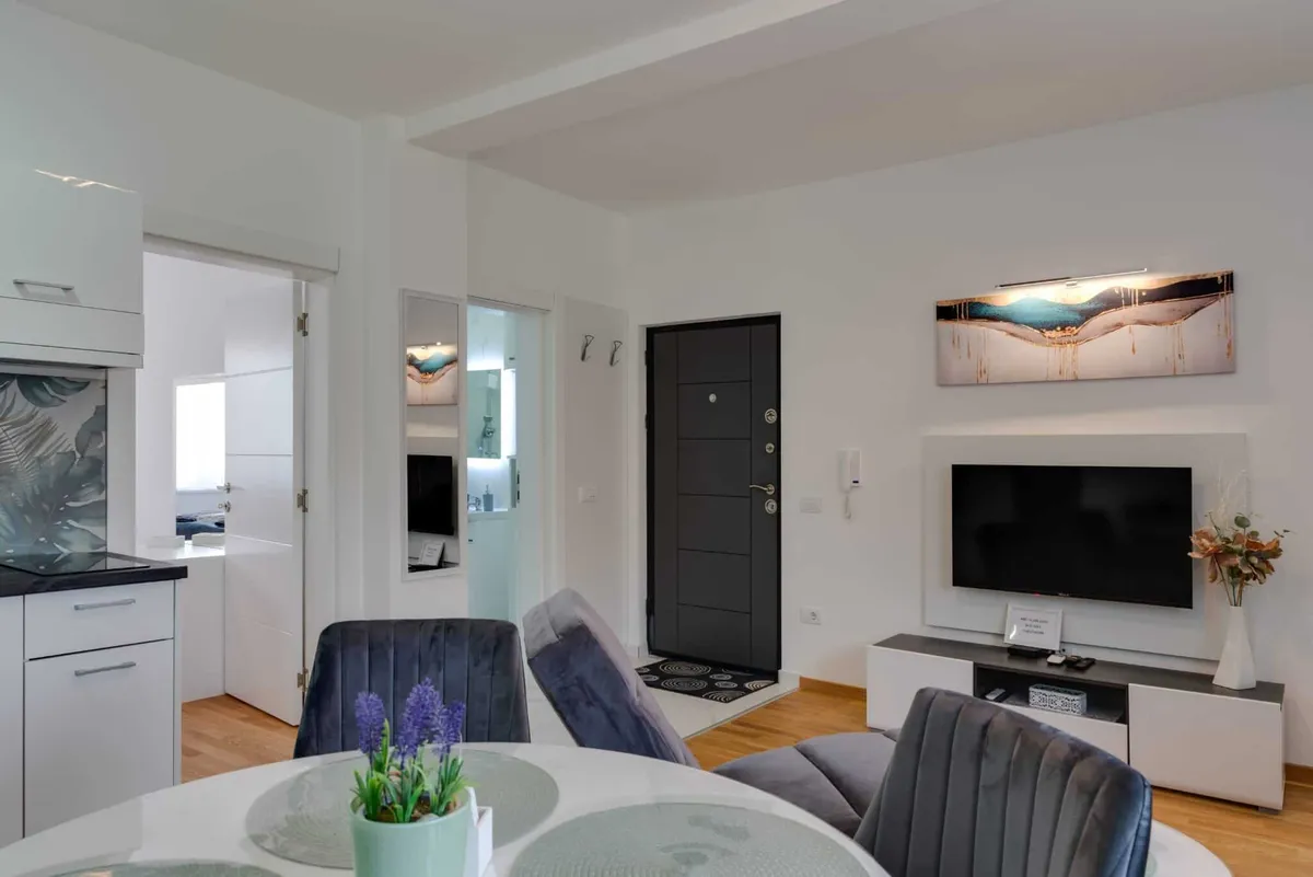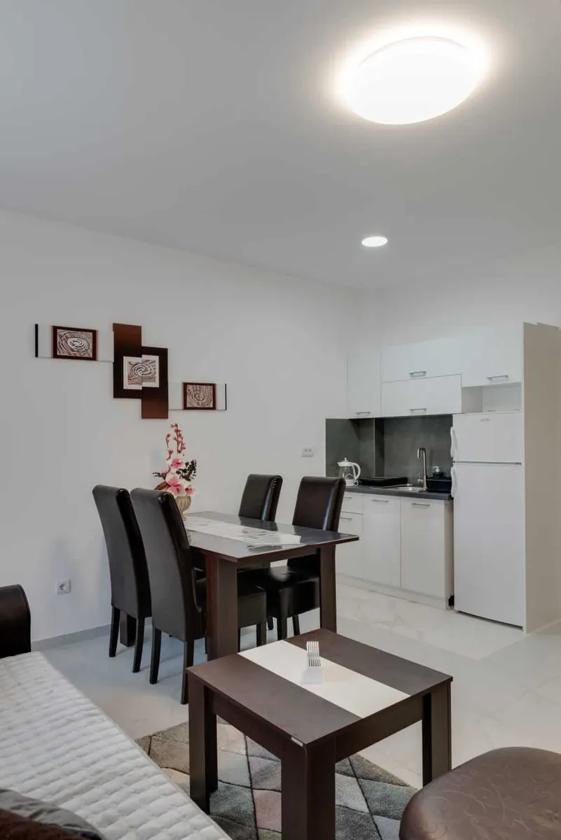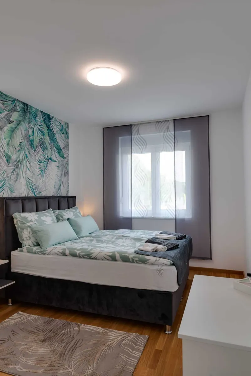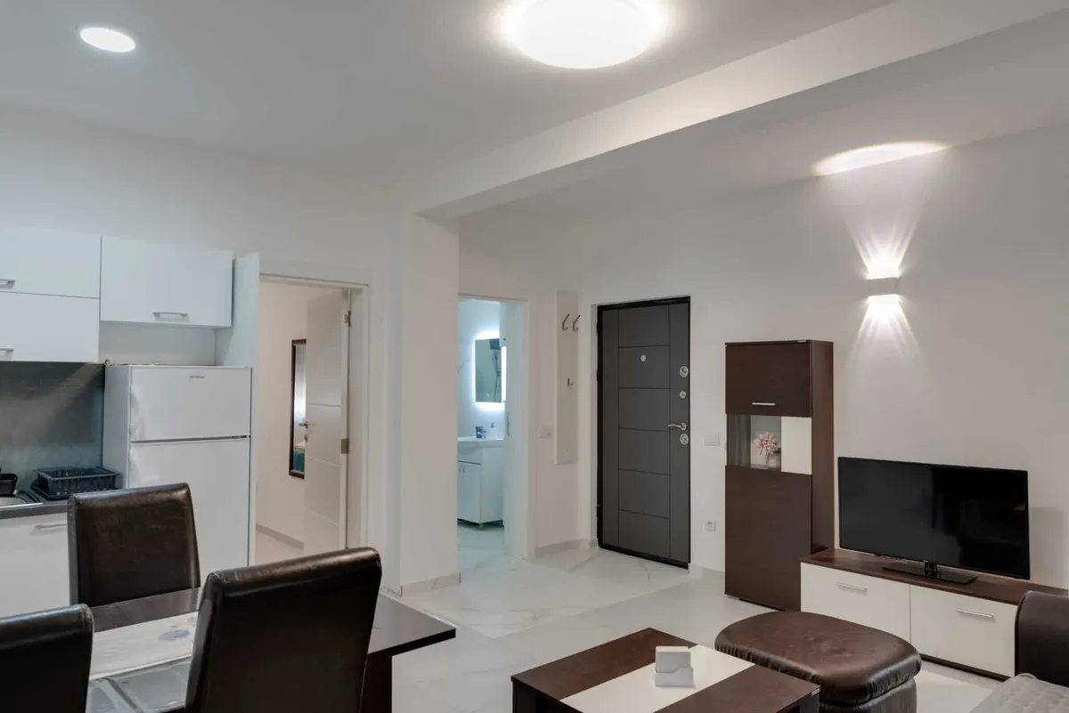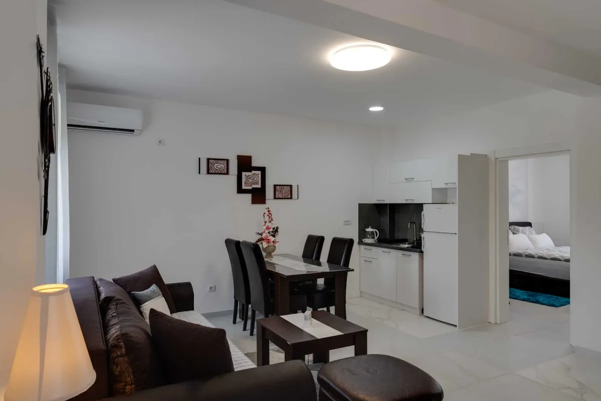 Poseduju odvojenu spavaću sobu sa francuskim ležajem, dnevnu sobu sa opremljenom kuhinjom, kupatilo sa tuš kabinom i terasu. Apartmani imaju klimu, WIFI i kablovsku televiziju. Zgrada ima lift i parking prostor. U neposrednoj blizini nalazi se market, pekara, apoteka, frizer i kozmetički salon...