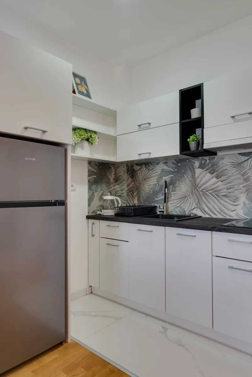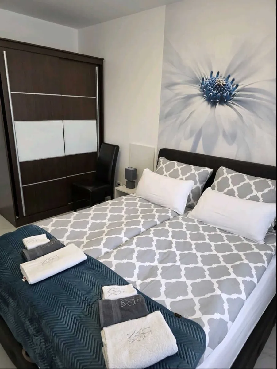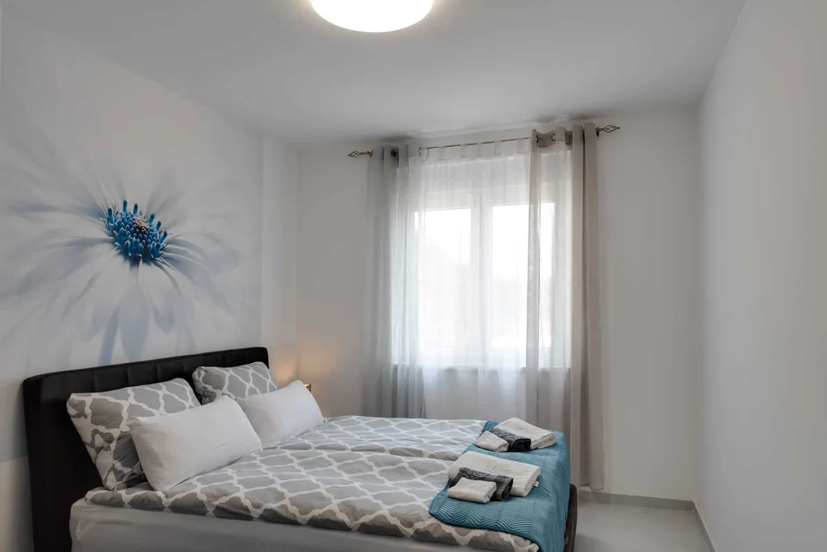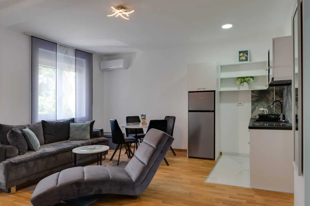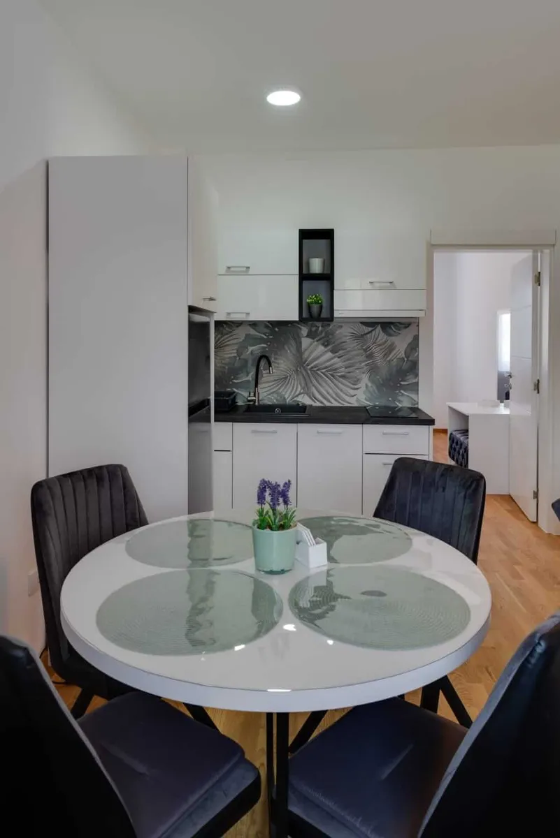Poseduju odvojenu spavaću sobu sa francuskim ležajem, dnevnu sobu sa opremljenom kuhinjom, kupatilo sa tuš kabinom i terasu. Apartmani imaju klimu, WIFI i kablovsku televiziju. Zgrada ima lift i parking prostor. U neposrednoj blizini nalazi se market, pekara, apoteka, frizer i kozmetički salon...