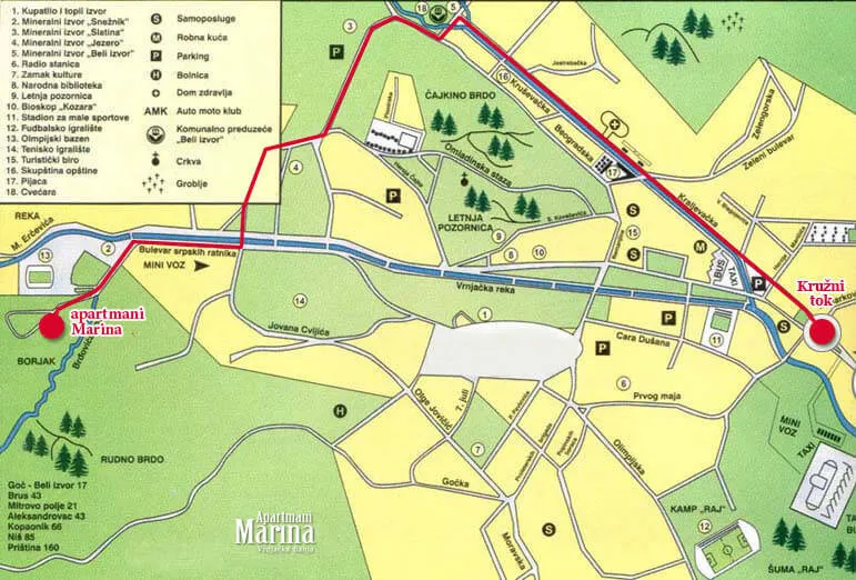 Turistički vozić staje nedaleko od apartmana. Centar Vrnjačke Banje je na 10 min. hoda šetalištem.