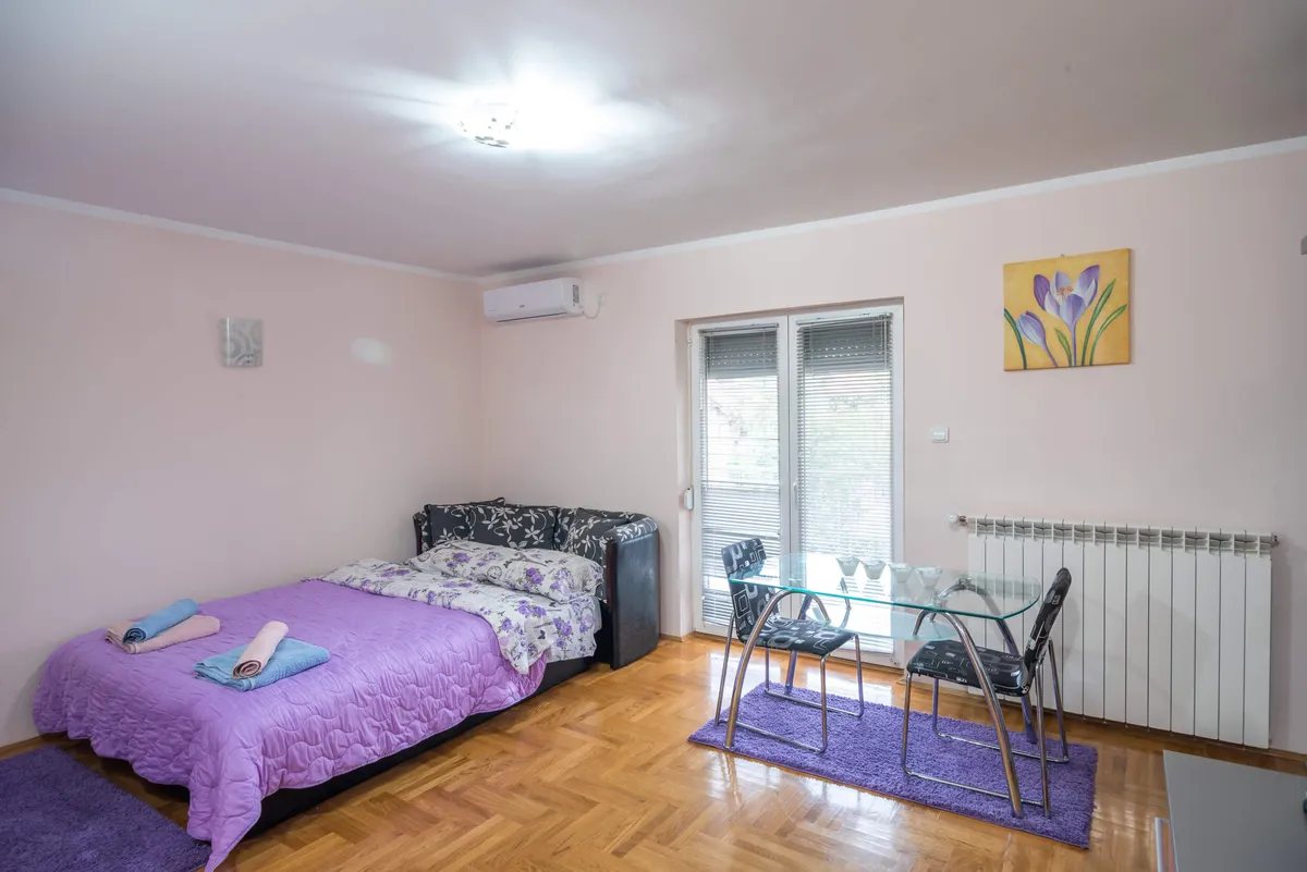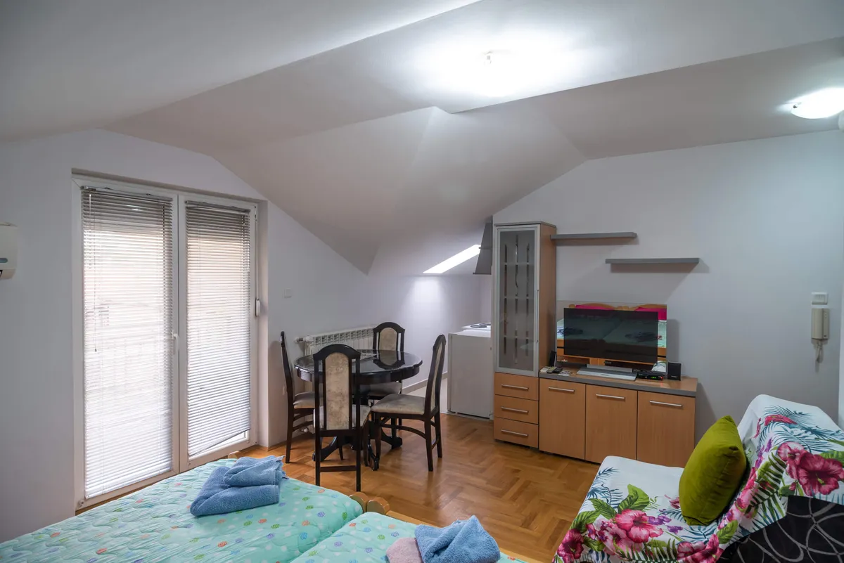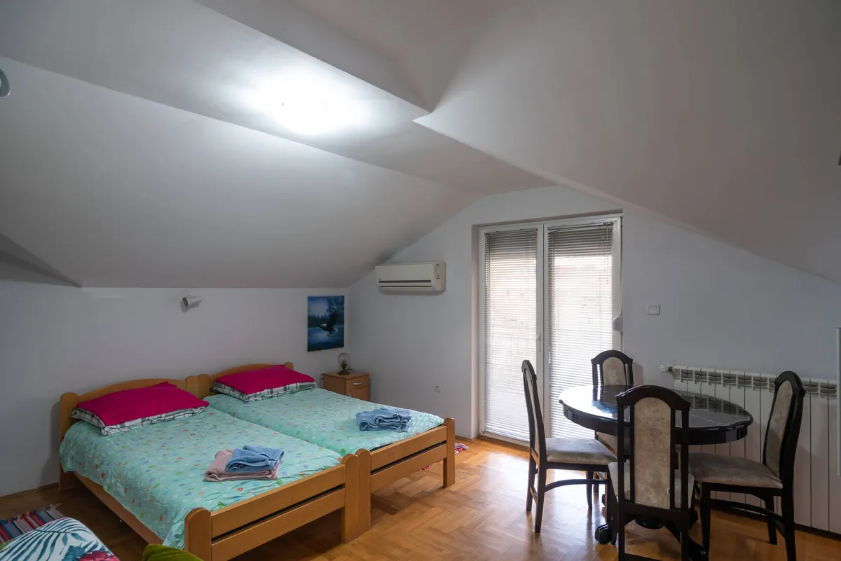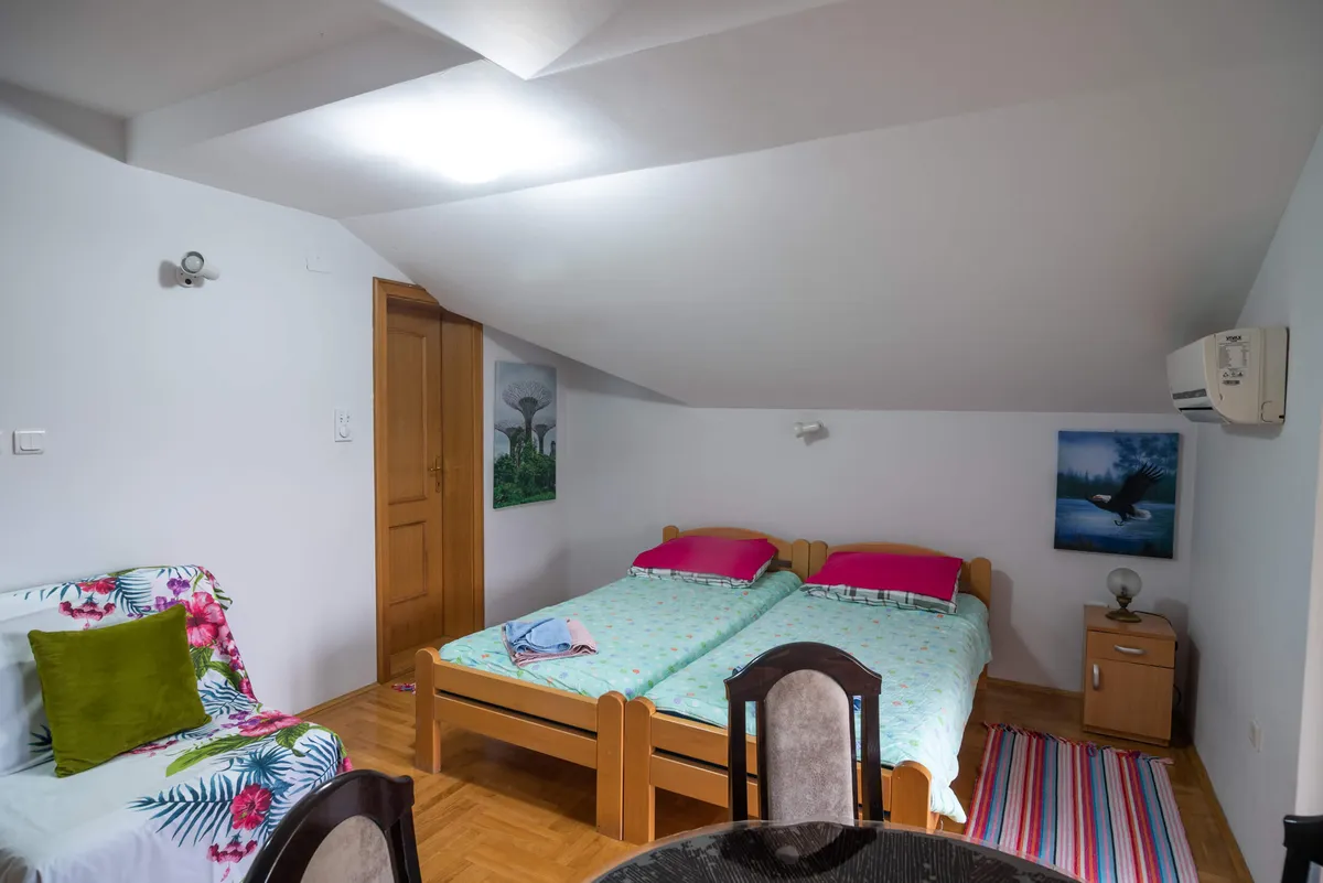 1. Apartman broj 1 poseduje odvojenu spavaću sobu, dnevni bravak sa kuhinjom, kupatilo i terasu. Namenjen je za boravak 2+2 osobe. Najam apartmana 40 evra.