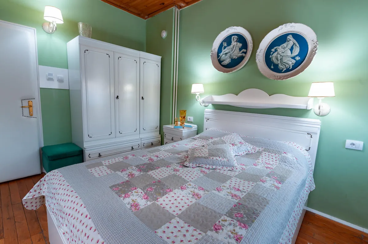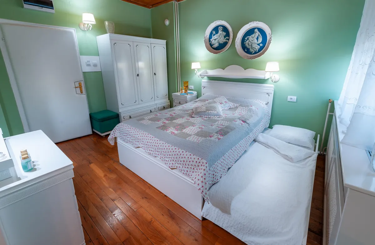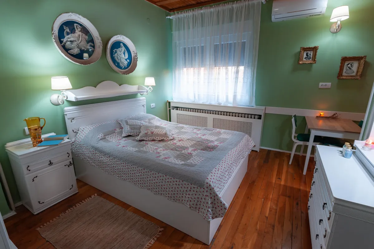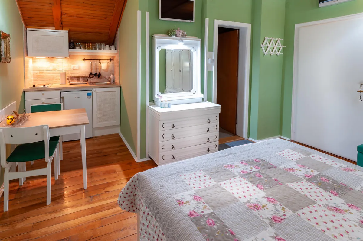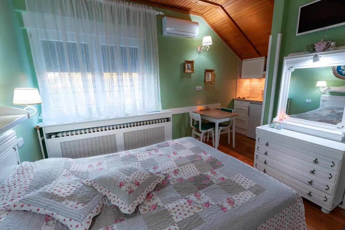 Studio Vintage (max tri odrasle osobe) nosi autentičnu romantičnu atmosferu Vrnjačke Banje prošog veka. Idealno za romantično ljubavno gnezdo. Pomoćni ležaj ga čini praktičnim rešenjem za smeštaj tri osobe.