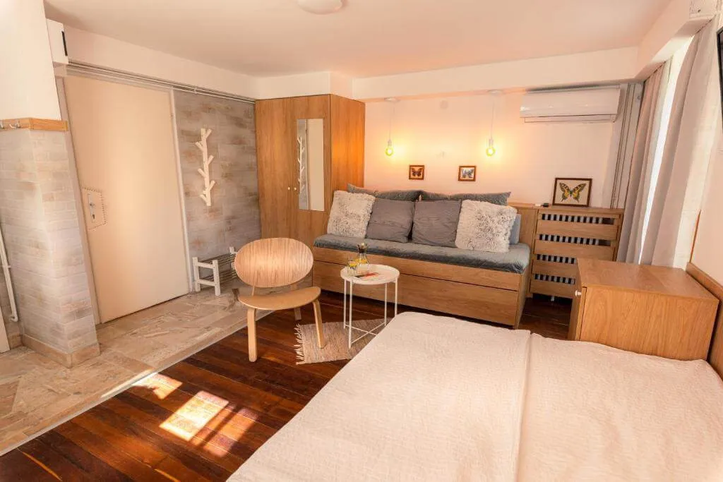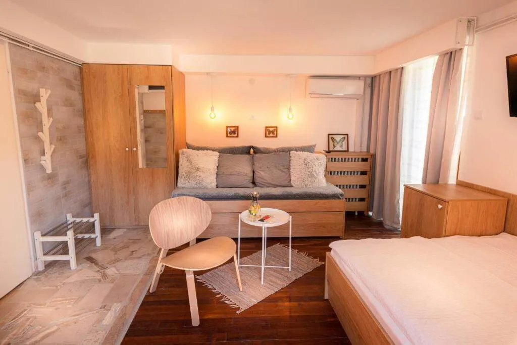 Studio Rustic (max četiri odrasle osobe) je elegantan porodični studio za praktične putnike. Kako je smešten u prizemlju, ima direktan izlaz na terasu u dvorištu. Idealan za porodice sa max dvoje dece.