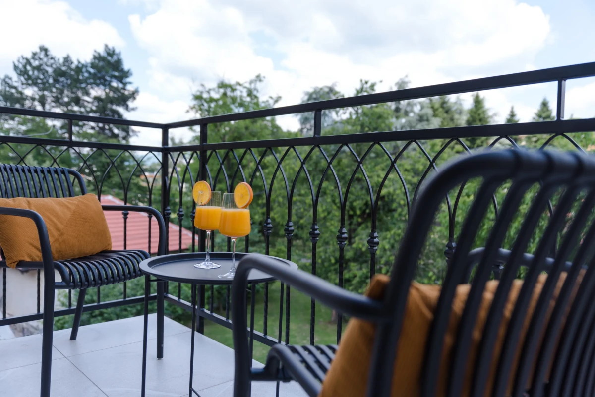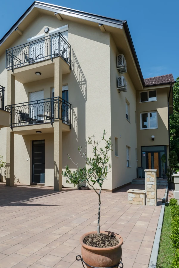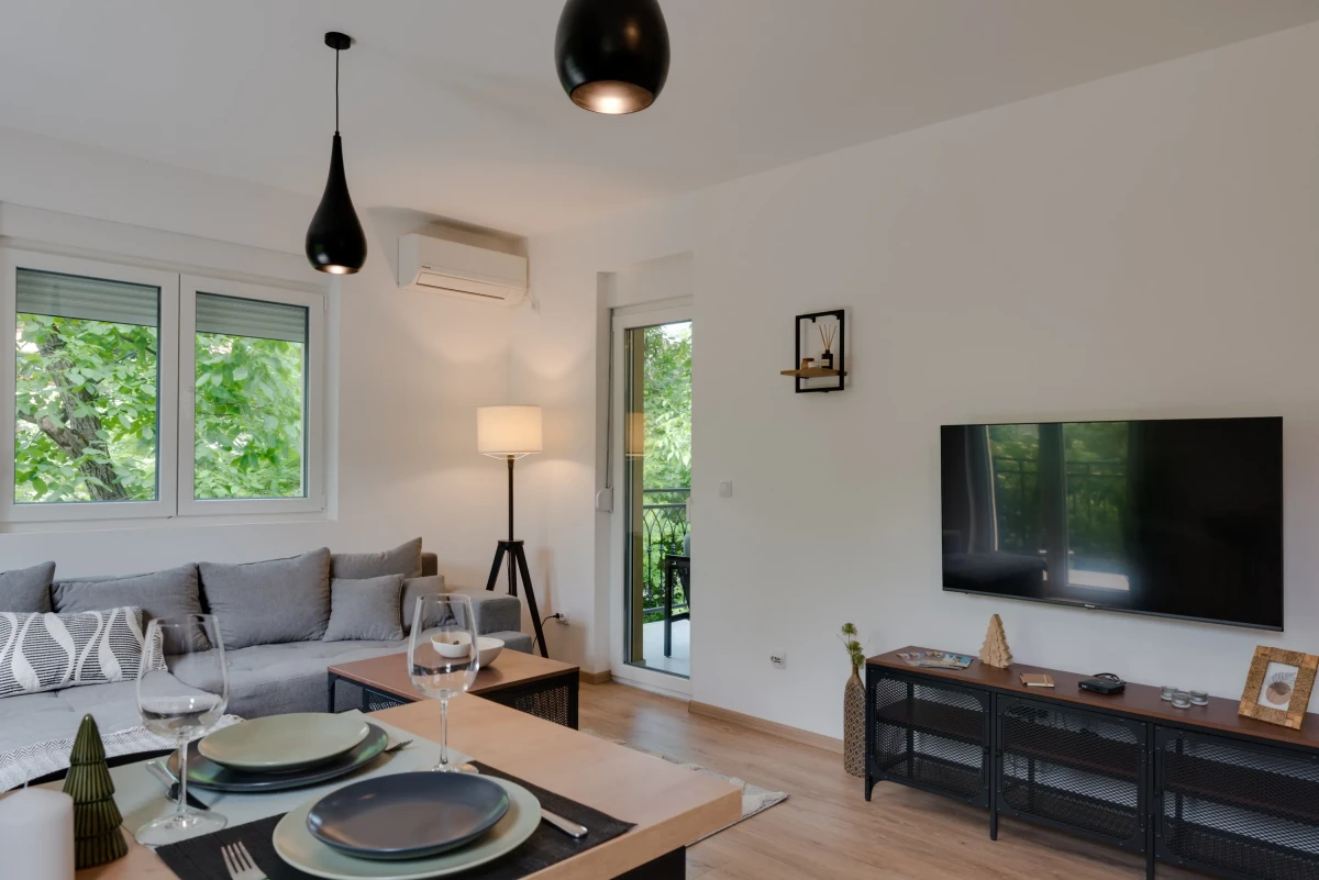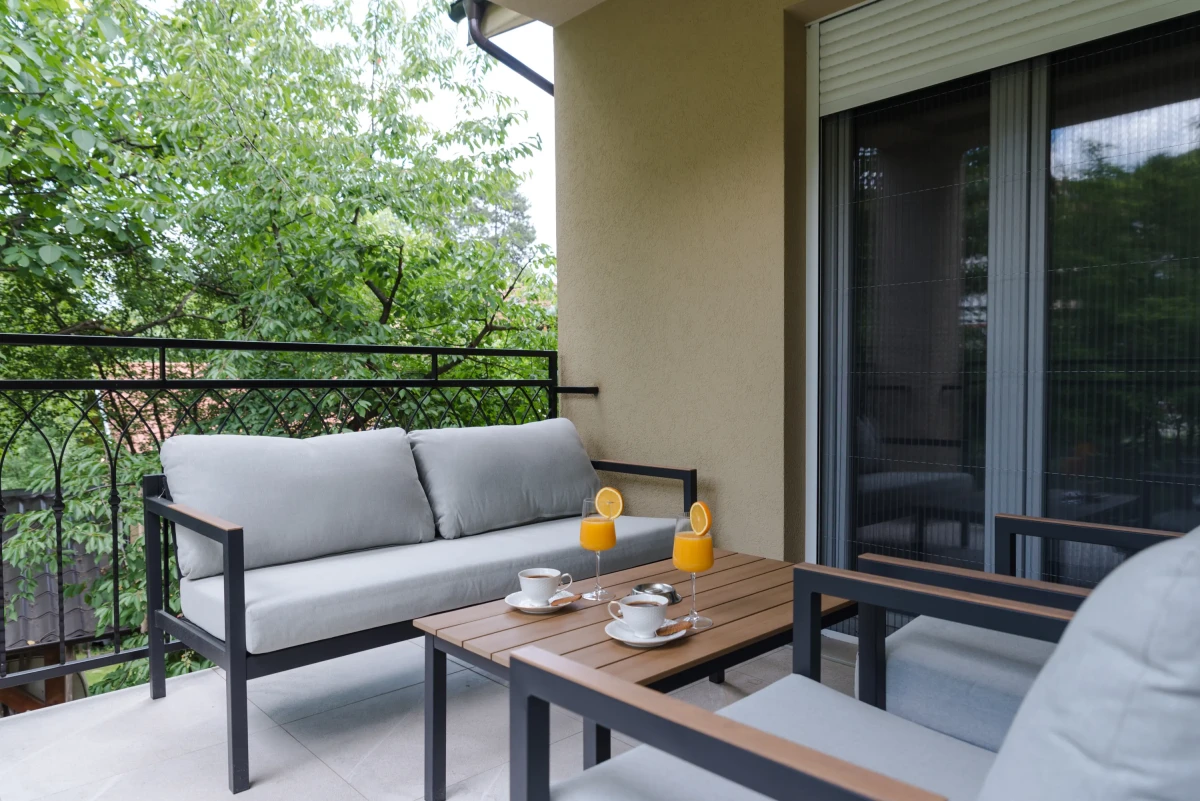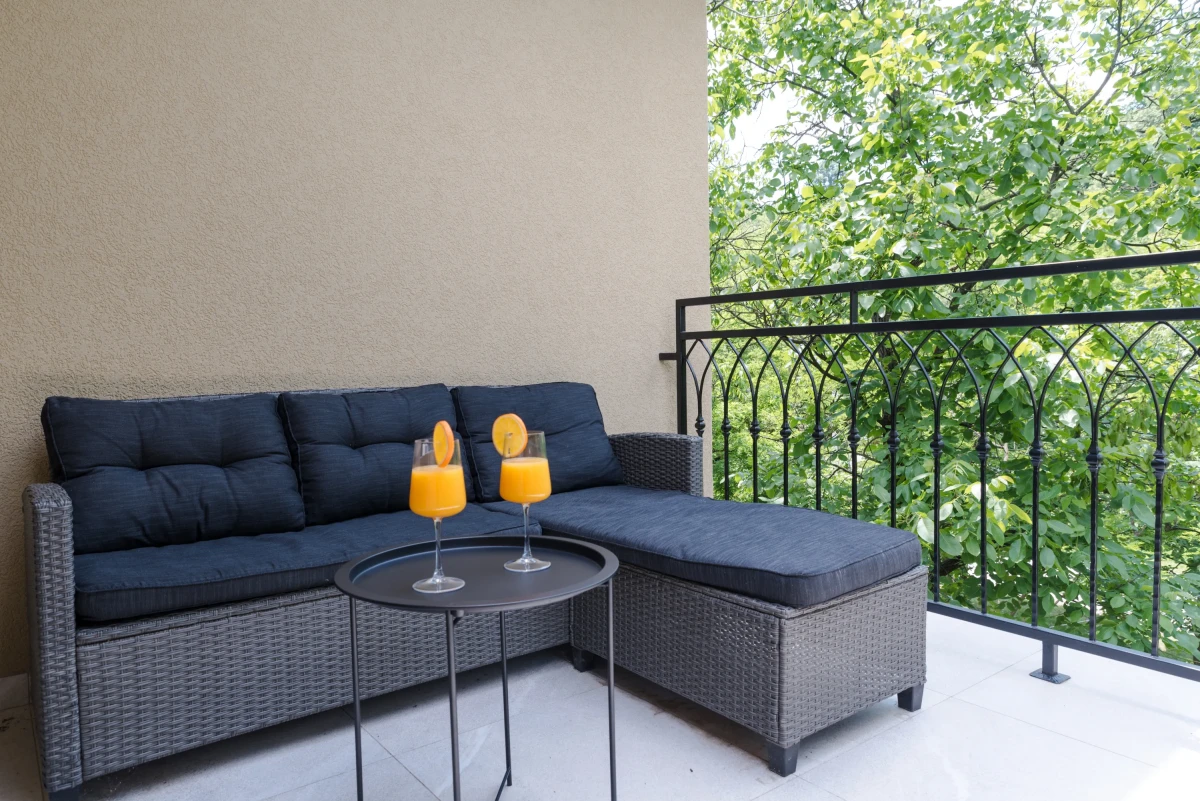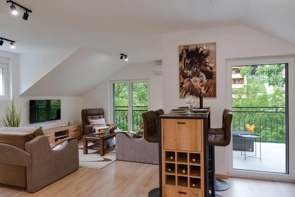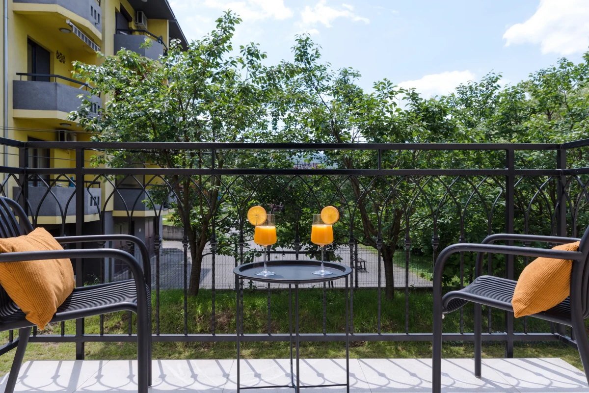 Svaki od apartmana nudi prelep pogled na planinu Goč kao i na samu Vrnjačku reku sa svojih prostranih terasa sa udobnim baštenakim nameštajem koji zadovoljava i najviše stamdarde ugoatiteljstva. Na 30 m od samog objekta se nalazi i početak staze za šetanje kroz borovu šumu koja odiše neverovatnom svežinom mladih četinara dok je na svega 100 m Japanski vrt i veliko dečije igralište. U blizini objekta postoji i veliki izbor restorana.