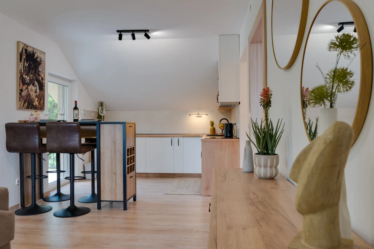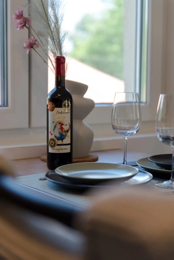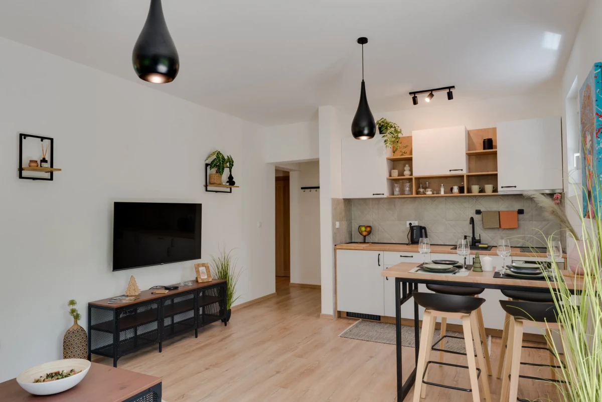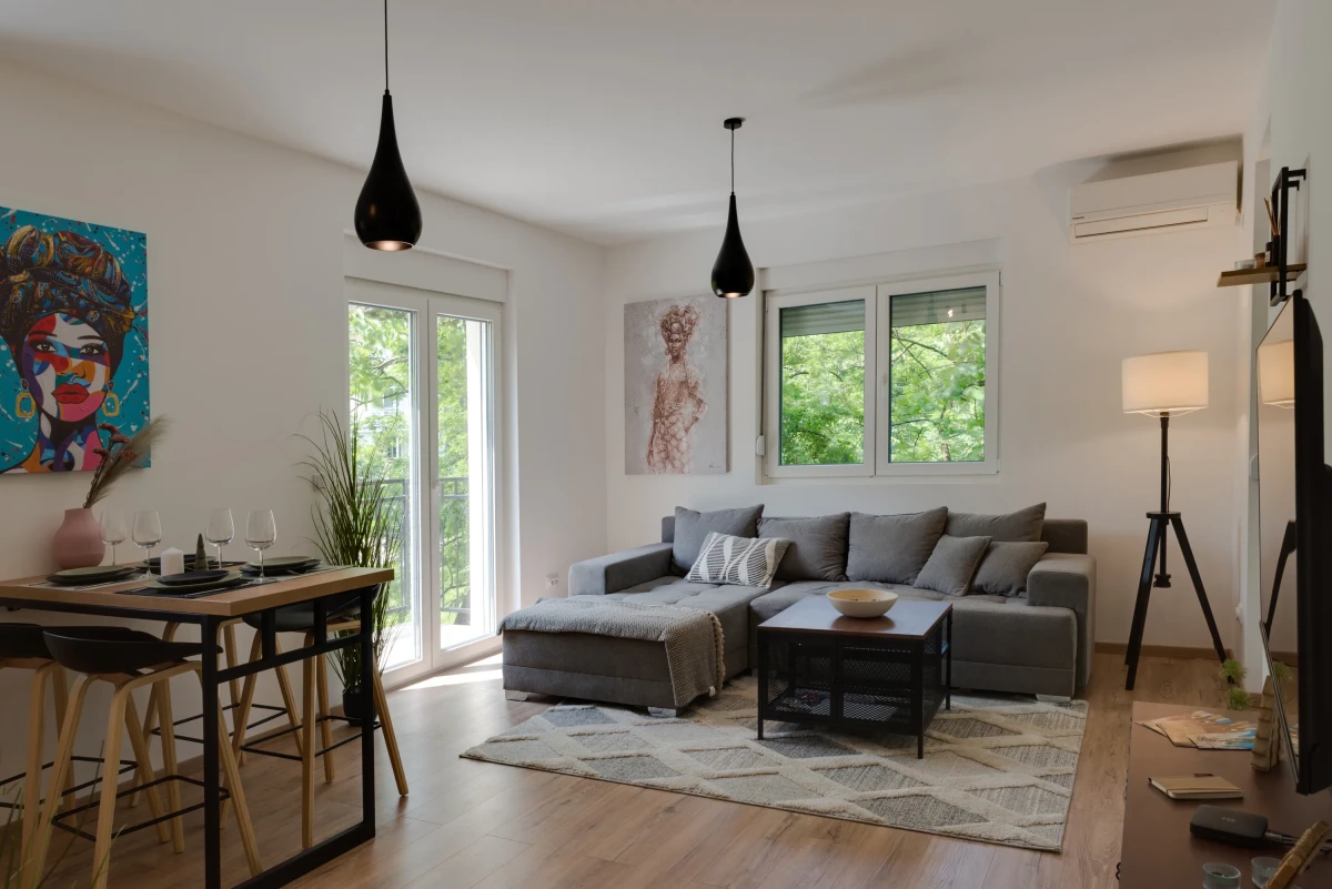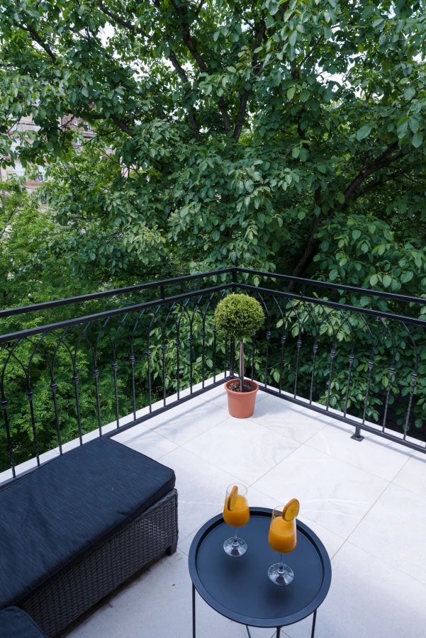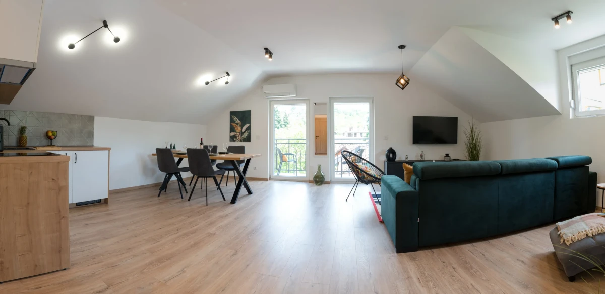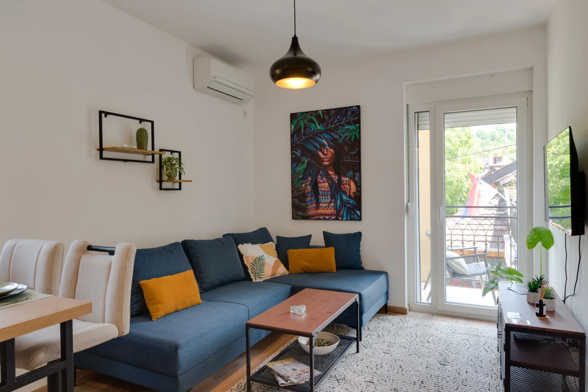 Svaki od apartmana nudi prelep pogled na planinu Goč kao i na samu Vrnjačku reku sa svojih prostranih terasa sa udobnim baštenakim nameštajem koji zadovoljava i najviše stamdarde ugoatiteljstva. Na 30 m od samog objekta se nalazi i početak staze za šetanje kroz borovu šumu koja odiše neverovatnom svežinom mladih četinara dok je na svega 100 m Japanski vrt i veliko dečije igralište. U blizini objekta postoji i veliki izbor restorana.