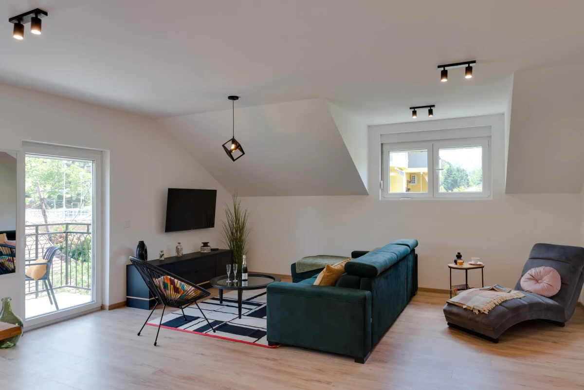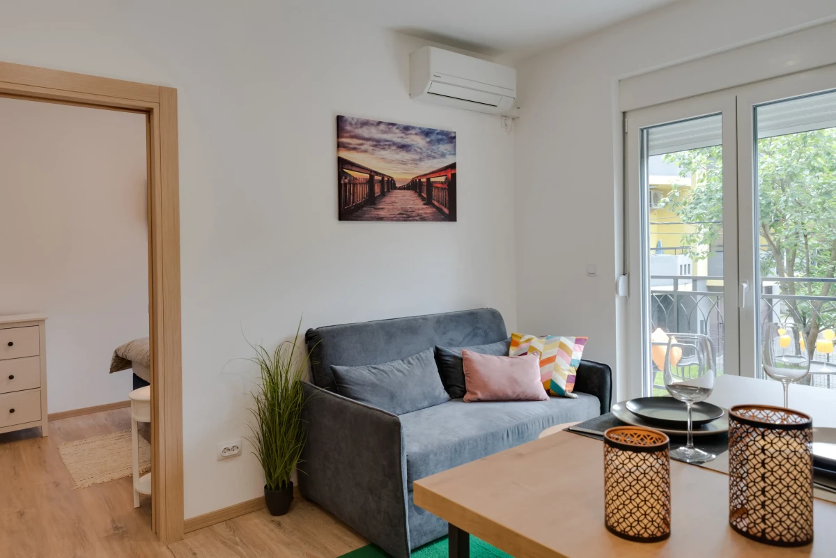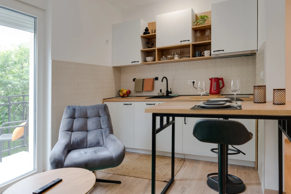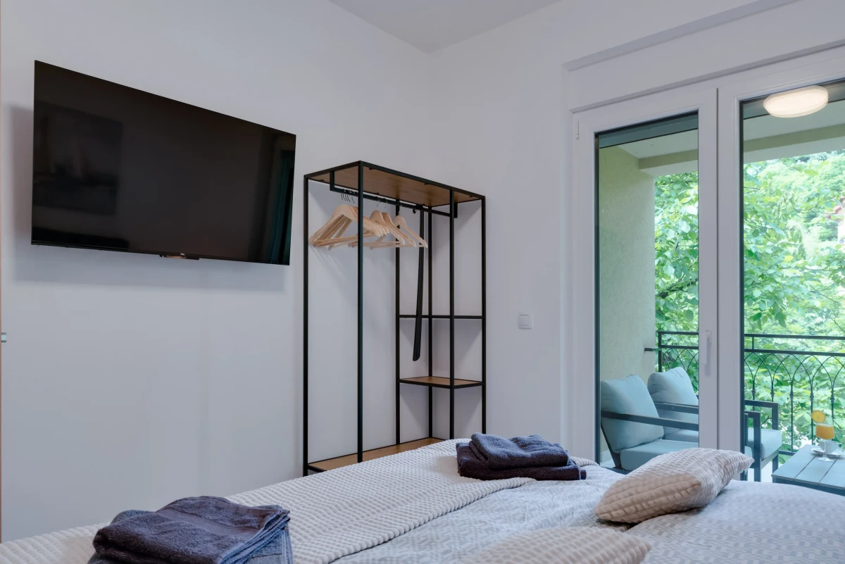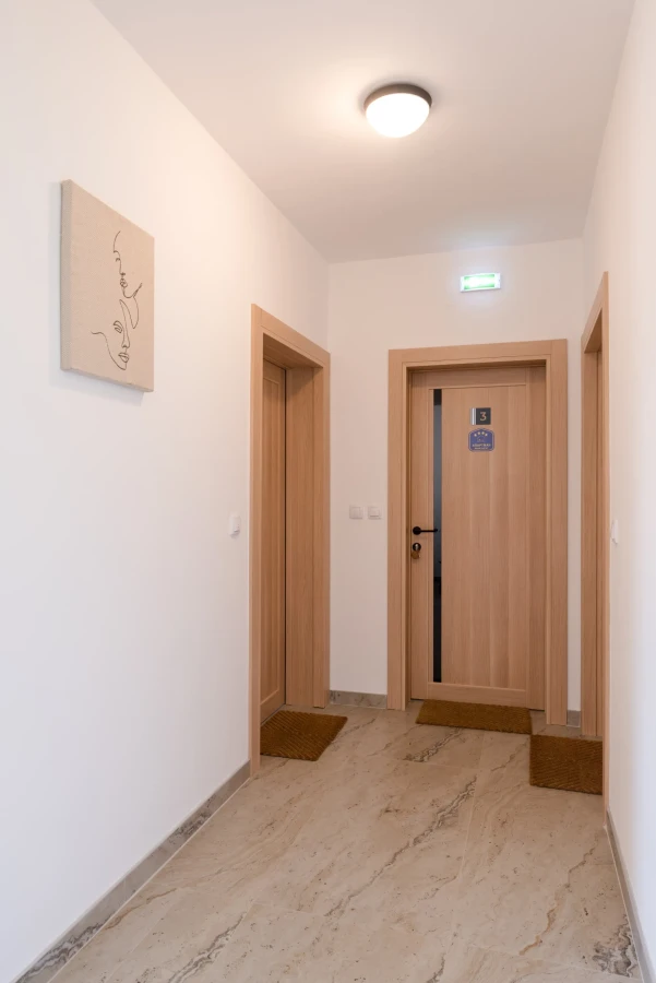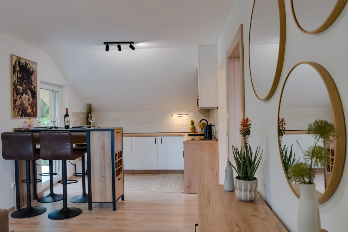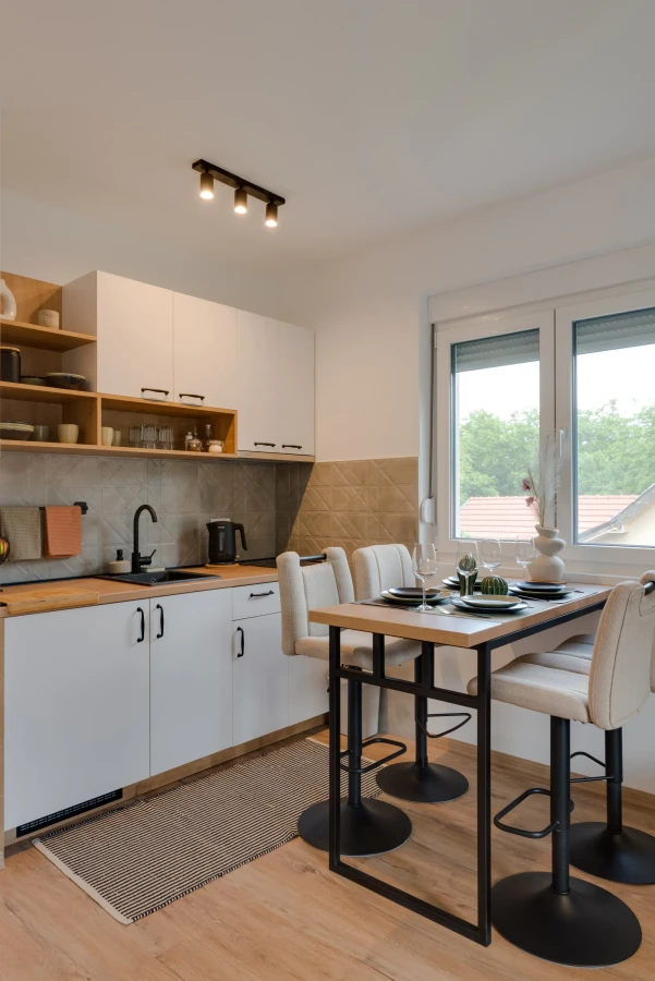 Svaki od apartmana nudi prelep pogled na planinu Goč kao i na samu Vrnjačku reku sa svojih prostranih terasa sa udobnim baštenakim nameštajem koji zadovoljava i najviše stamdarde ugoatiteljstva. Na 30 m od samog objekta se nalazi i početak staze za šetanje kroz borovu šumu koja odiše neverovatnom svežinom mladih četinara dok je na svega 100 m Japanski vrt i veliko dečije igralište. U blizini objekta postoji i veliki izbor restorana.