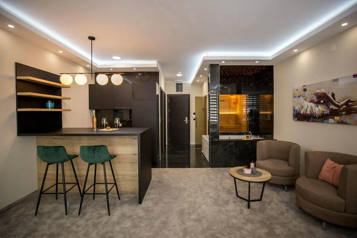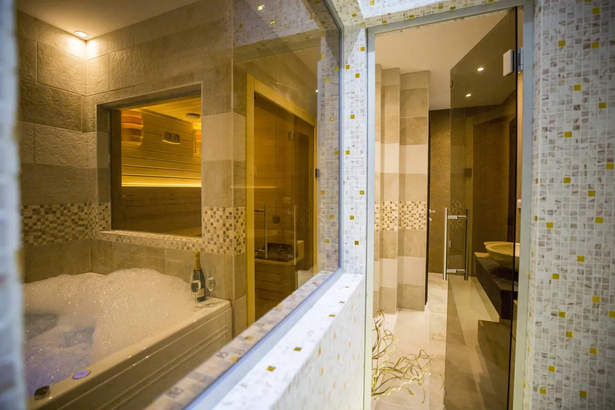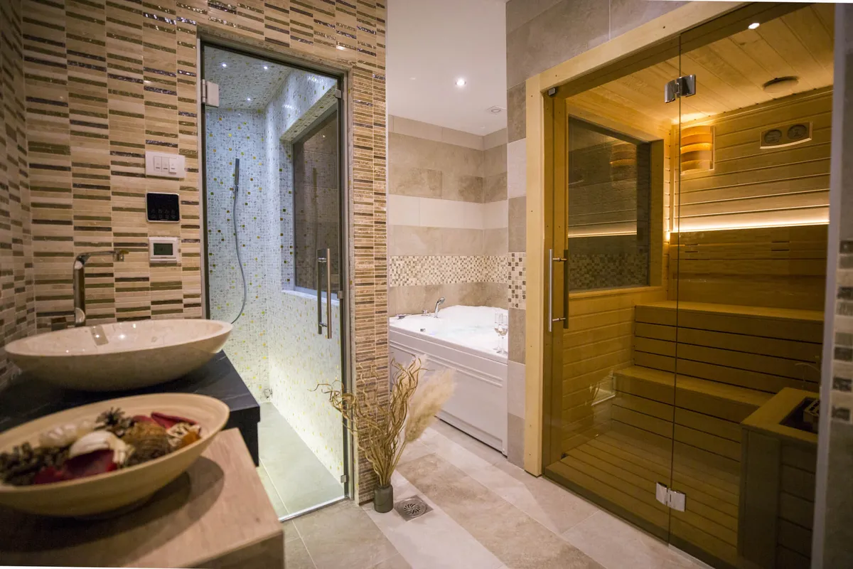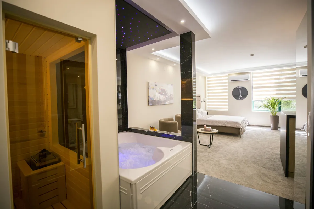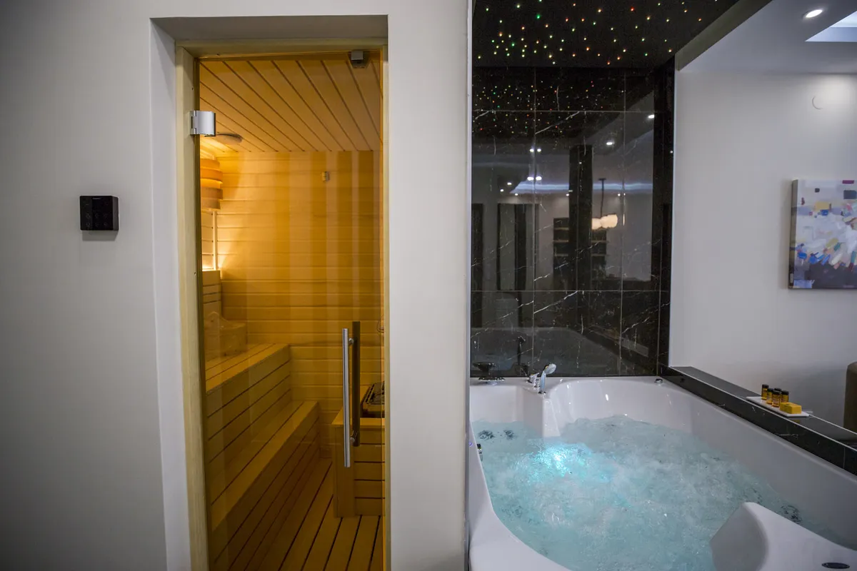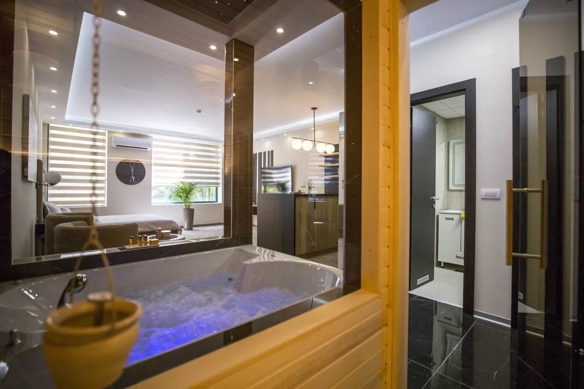Hidromasažne đakuzi kade, sauna i tursko kupatilo sastavni su deo spa zone ovih luksuznih apartmana što omogućava potpuno intimni spa ugođaj, relaksaciju I opuštanje.